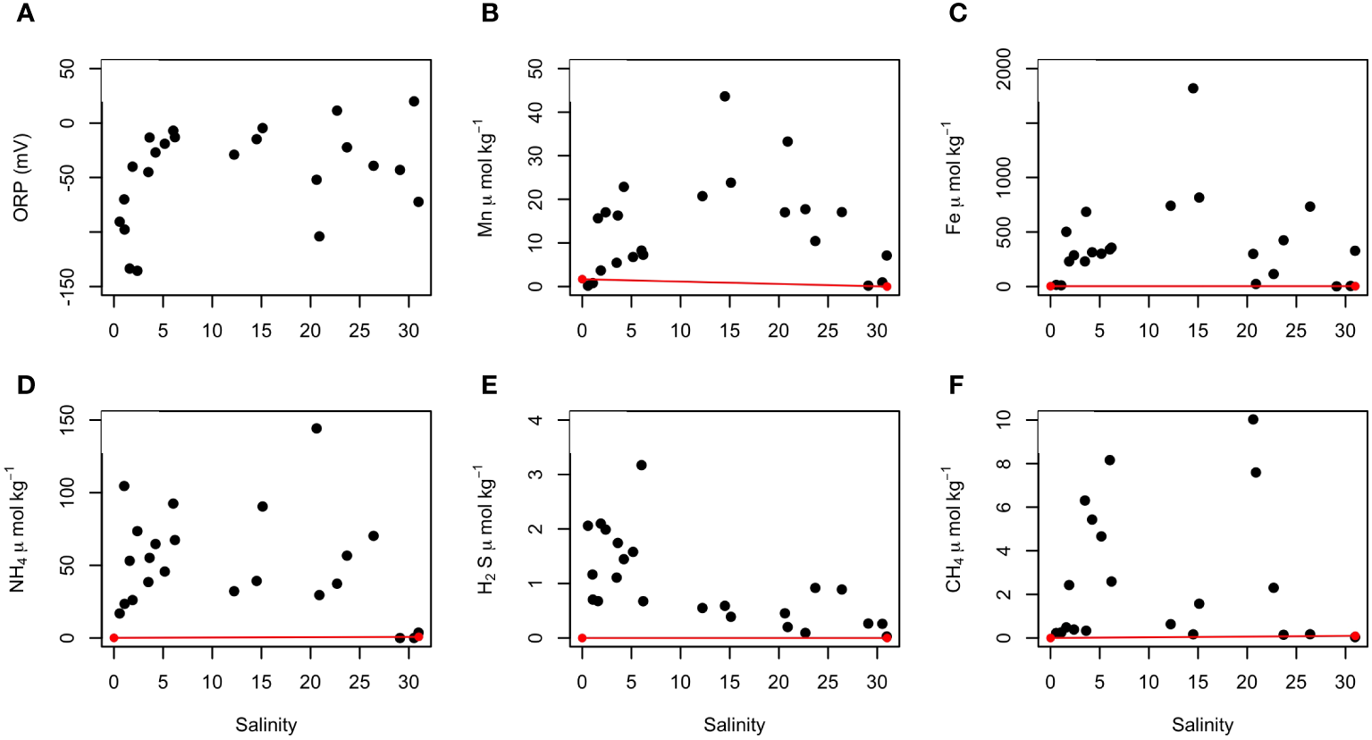Distribution of redox-sensitive species along the practical salinity gradient in the STE. (A) redox potential (ORP vs. Ag/AgCl reference electrode), (B) total dissolved Mn, (C) total dissolved Fe, (D) ammonia, (E) sulfide and (F) methane concentrations. Mean concentrations of redox-sensitive species in inland groundwater and seawater (in Table 1) are also reported (red dots) and a conservative mixing line is drawn for each species (red lines) using a salinity-based mixing model.