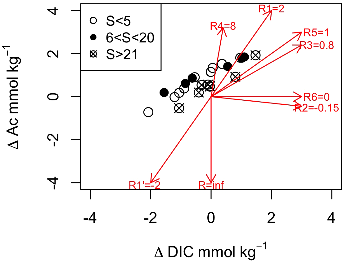 Relationship between DIC and Ac along the Martinique Beach STE. The stoichiometric ratio of TA to DIC is reported for carbonate mineral precipitation and dissolution (R1 = 2 and -2), oxic respiration (R2=-0.16 based on Chen and Wang (1999)), denitrification (R3 = 0.8), iron (R4 = 8) and sulfate (R5 = 1) reduction and methanogenesis (R6 = 0). Note that the oxidation of reduced iron and sulfides by oxygen leads to an infinite ratio.