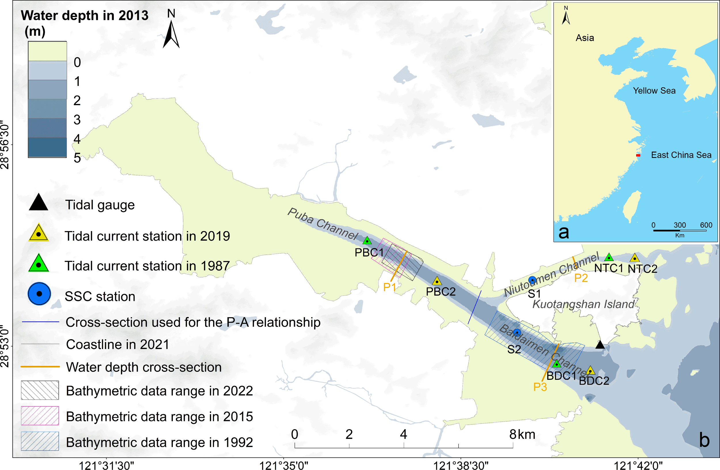 Tidal flows move sediment into and out of tidal bays, generating tidal flats and channels and controlling their geomorphology. In general, an equilibrium status will be reached when the ebb tidal velocity is sufficient to flush out the sediment load being pushed into the bay during the flood tide (Serrano et al., 2013). However, such a static equilibrium rarely exists in coastal environments (Xie et al., 2017a). The dynamic equilibrium concept was proposed by Friedrichs (2011) where the choice of temporal scale is imperative to analyze the morphological equilibrium type (Zhou et al., 2017). Under the influence of natural drivers, tidal morphology generally reaches a dynamic equilibrium over annual or longer temporal scales (Friedrichs, 2011).