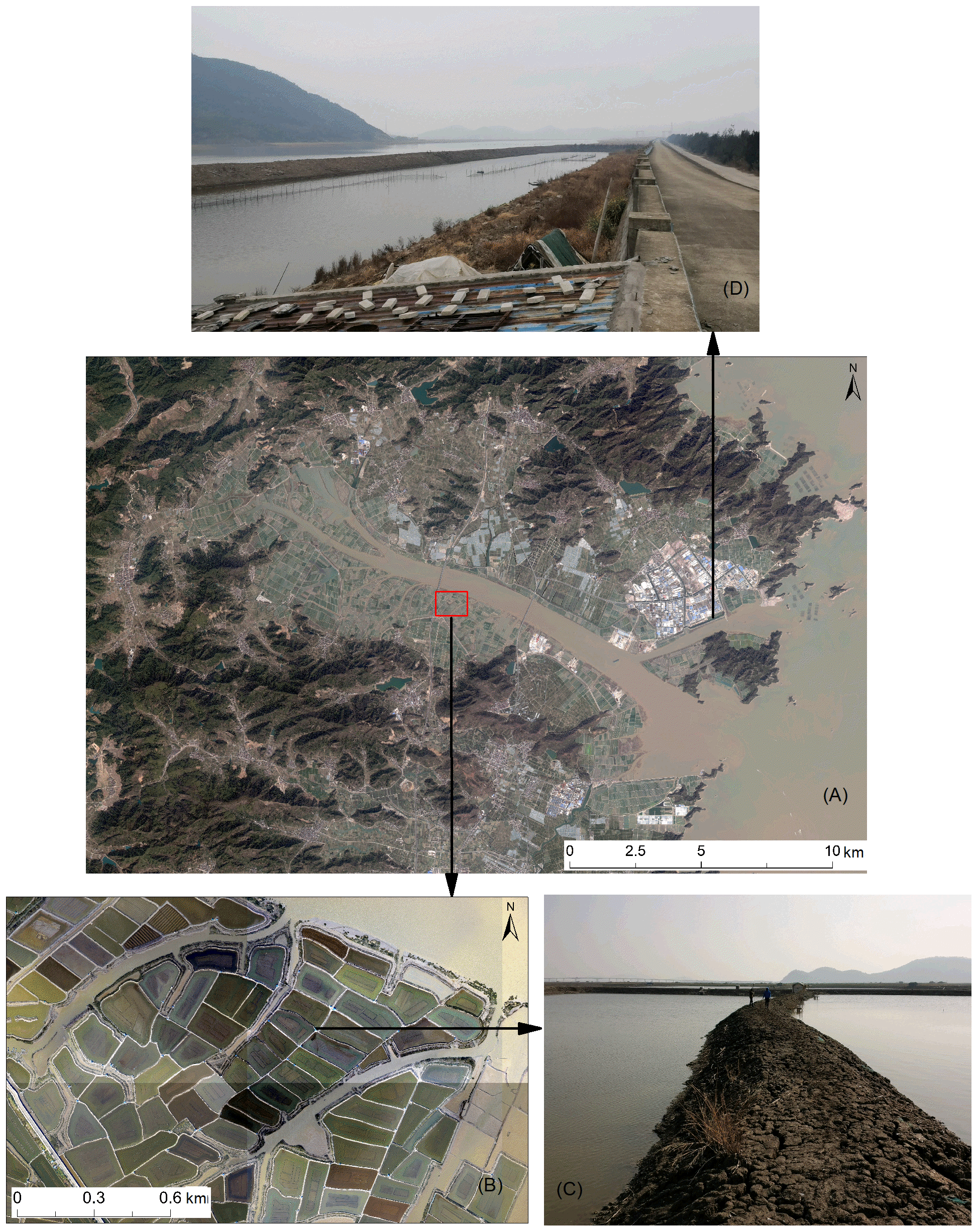 (A) Aerial photographs covering the study area in 2020; (B) Aerial photographs enlarged on a specific area of mariculture ponds; (C) Photo of mariculture ponds taken in 2020; (D) Photo of a concrete seawall which is the boundary of coastal reclamation.