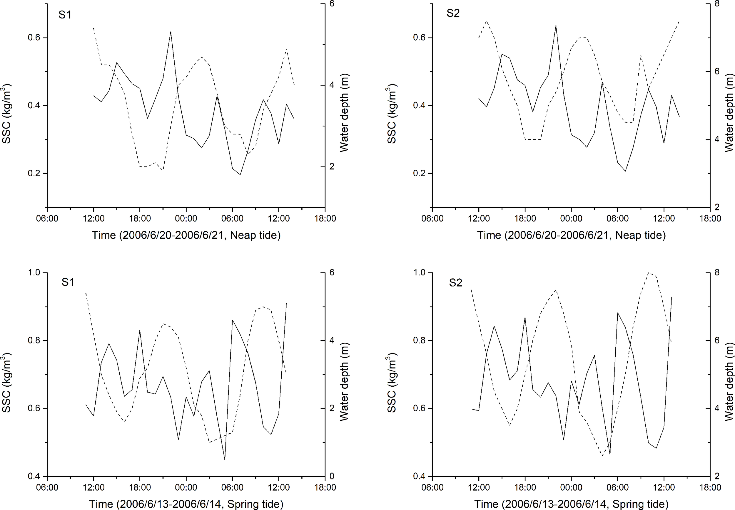 According to the observed data, SSC exhibited temporal changes during a spring-neap tidal cycle (Figure 5). The vertical average SSC decreased from the spring to neap tides, and its maximum value was 0.928 and 0.636 kg/m3 during the spring and neap tides, respectively. The SSC curve had two troughs (appearing at tidal slack) and two crests (appearing after the maximum flow velocity) during a flood-ebb tidal cycle because of the erosion lag effect. The trends in SSC changes at S1 and S2 were consistent during the same tidal phase; however, the SSC at S2 was higher than that at S1, possibly confirming that the BDC is the main channel for material transport.