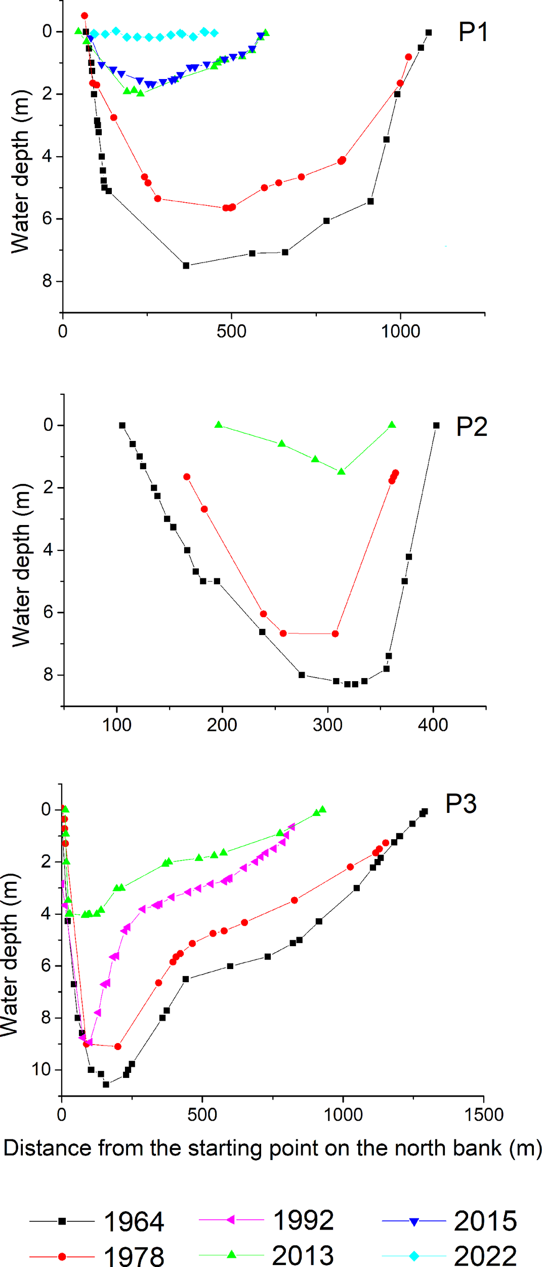 In each of the three channels, a cross-section was established. The cross-sections were selectively placed at major terrain fluctuations or changes in each channel (Figure 1). The typical cross-sectional topography, as shown in Figure 8, was characterized by siltation features, manifesting as a continuous narrowing of the cross-sectional width and shallowing of the water depth. Between 1964 and 2022, the maximum width and water depth of the P1 section decreased by 660 and 7.3 m, respectively. In 2022, the width and depth of this section were only 350 and 0.2 m, respectively. If the siltation continued, the topography of this section would separate from the underwater environment, and the 0 m isobath would continue to retreat towards the bay mouth. Between 1964 and 2013, sections P2 and P3 narrowed in width by 130 and 380 m, respectively, and t heir maximum water depths decreased by 6.8 and 6.5 m, respectively. In 2013, the width and depth of the two sections were 160 and 1.5 m, and 910 and 4.0 m, respectively. The NTC nearly vanished because of siltation, with BDC becoming the primary waterway for material movement.