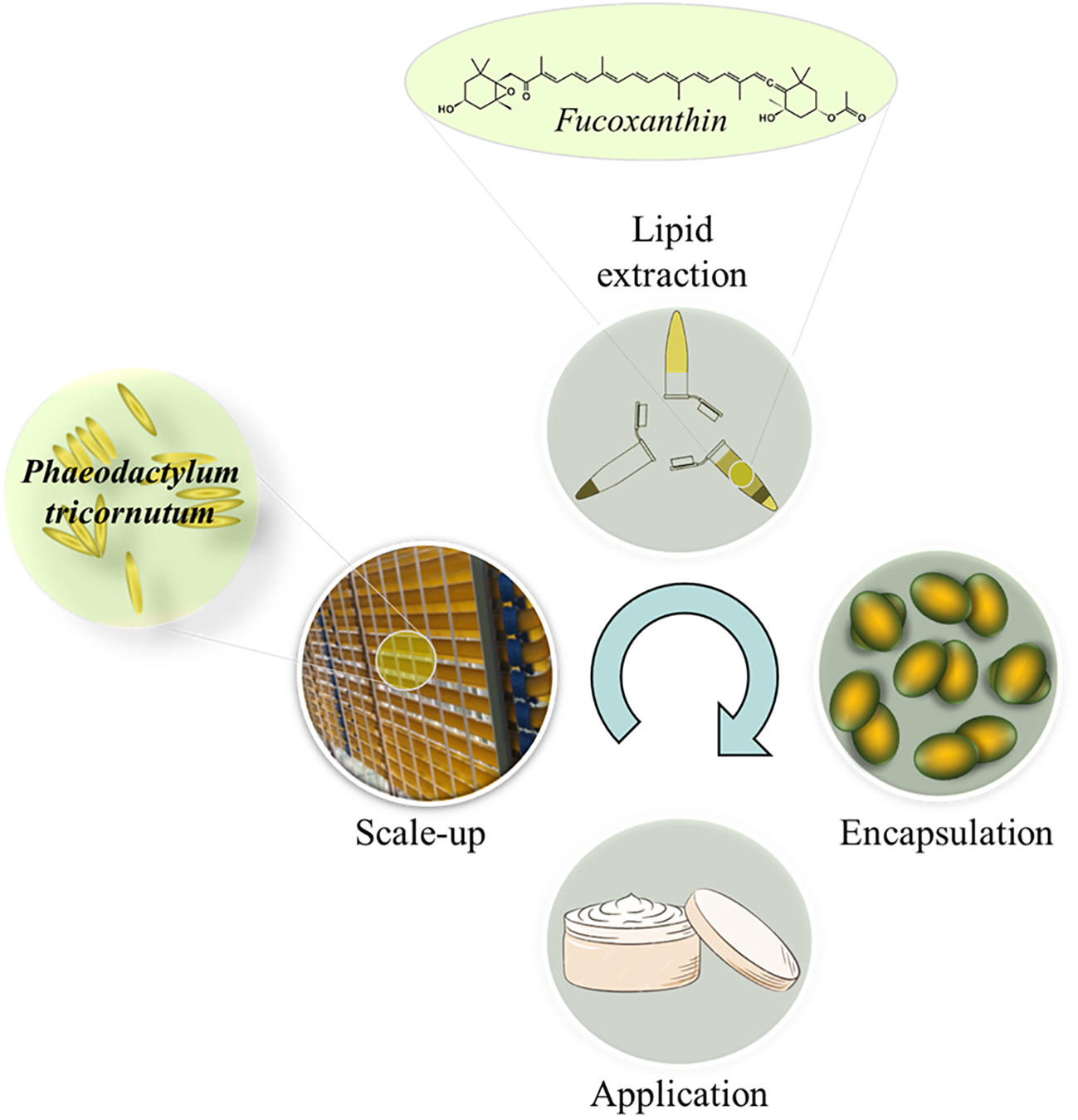 The nutraceutical market has experienced a significant growth over the last years, due to changing consumer preferences towards products of natural and organic origin. One of the main areas of interest in this field is microalgae-derived carotenoids, whose antioxidant activity protects against oxidative damage in human cells. The diatom Phaeodactylum tricornutum has been widely studied due to its high fucoxanthin content (antioxidant carotenoid). However, pilot and industrial scale experiments to realize continuous and stable production of P. tricornutum and extracted fucoxanthin are limited. For this reason, this research focuses on the study of the fucoxanthin production, going through culture, harvesting, scaling procedure and encapsulation stage. Finally, the optimal culture conditions for a fucoxanthin production of 2.5 mg/day/L were verified. Furthermore, the antioxidant capacity showed a decrease during storage, but still presented a capacity of 18 months, with improved performance when encapsulated with spirulina. The study carried out on encapsulated fucoxanthin-spirulina shows an inhibitory effect on lipogenesis at all concentrations tested in the 3T3-L1 cell line and a lipolytic efficacy at concentrations of 0.2 mg/mL and 0.1 mg/mL in the 3T3-L1 cell line.