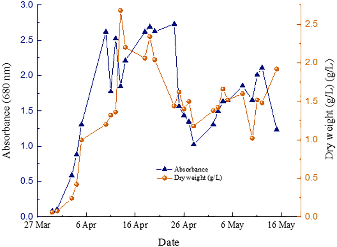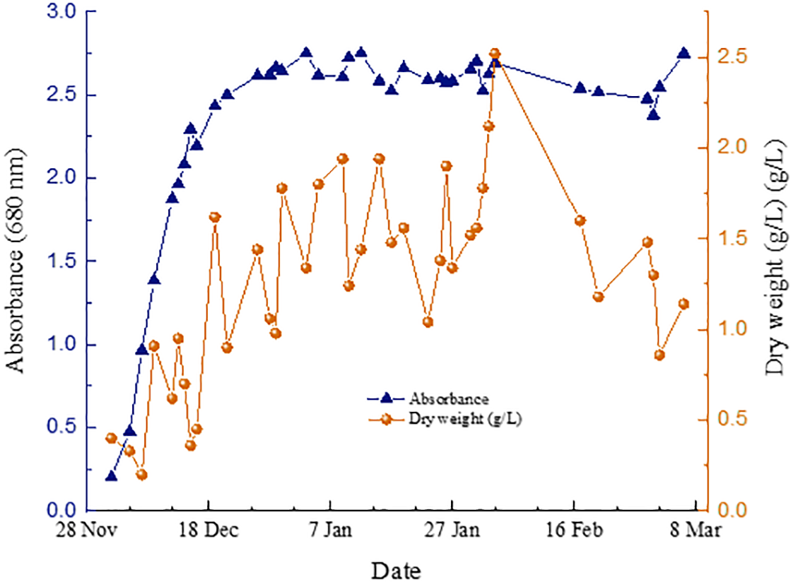Figure 4 shows the P. Tricornutum microalgae production under low light intensity conditions from December 2022 to February 2023, while Figure 5 shows the equivalent for medium light intensity conditions from April 2023 to May 2023.