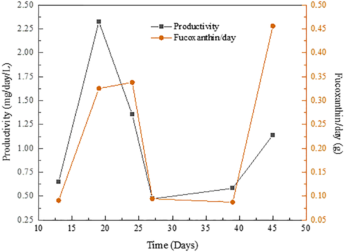 Fucoxanthin productivity from P. tricornutum growth in tubular PBR at medium light intensity.