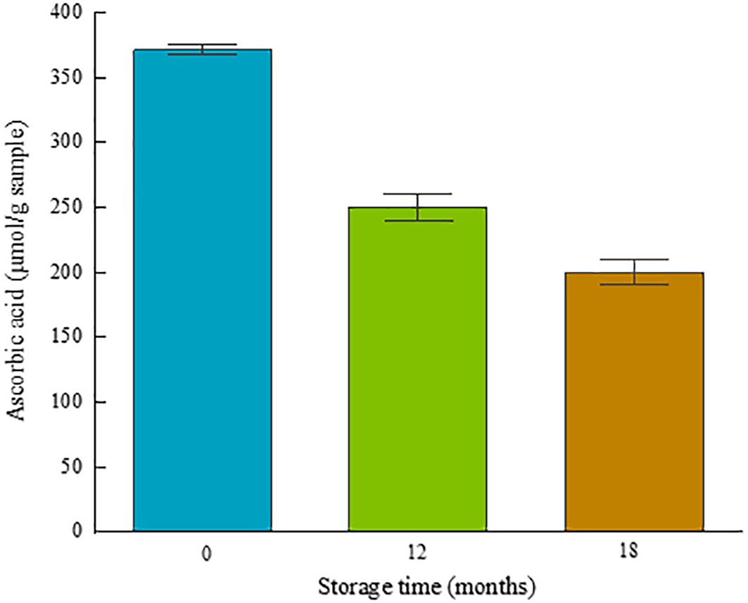 The stability of the antioxidant capacity of fucoxanthin during storage was evaluated in three different periods of time (0, 12 and 18 months). This parameter was analyzed by the company Bioquochem S. L., according to an ABTS (2,2-azinobis-(3-ethylbenzothiazoline-6-sulfonate) antioxidant capacity test kit (KF01002, Bioquochem, Spain). The ABTS assay is based on the generation of the blue/green ABTS·+ chromophore (maximum absorbance 734 nm) (Vuolo et al., 2018). Subsequently, the antioxidant present in the sample reduces the ABTS, resulting in a discoloration of the solution proportional to the antioxidant activity/capacity and concentration. A vitamin C standard (vitamin C equivalent antioxidant capacity) was used to standardize and compare the TAC of the sample.