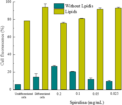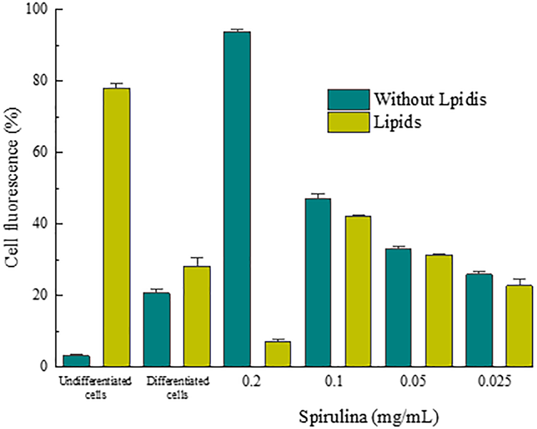 The results of the lipogenesis inhibition test are presented in Figure 12, which shows the percentage of fluorescence of 3T3-L1 cells at different concentrations. This clearly shows that the lipogenesis inhibitory activity is directly dependent on the spirulina-fucoxanthin content of the sample.