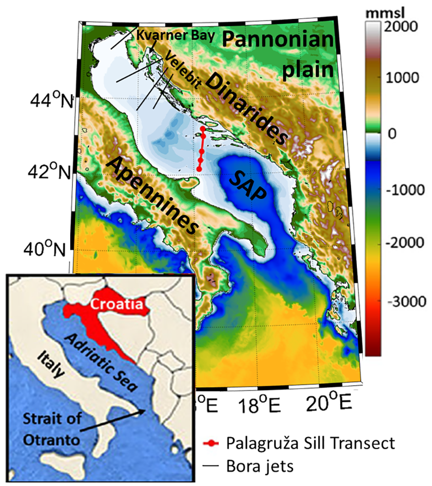 AdriSC WRF 3-km domain and topography, AdriSC ROMS 1-km domain and bathymetry, along with geographical features of the region – Apennines, Dinarides, Pannonian plain, Velebit Mountain, Kvarner Bay and Southern Adriatic Pit (SAP). Palagruža Sill Transect is presented in red, along with bora jets presented as black lines.
