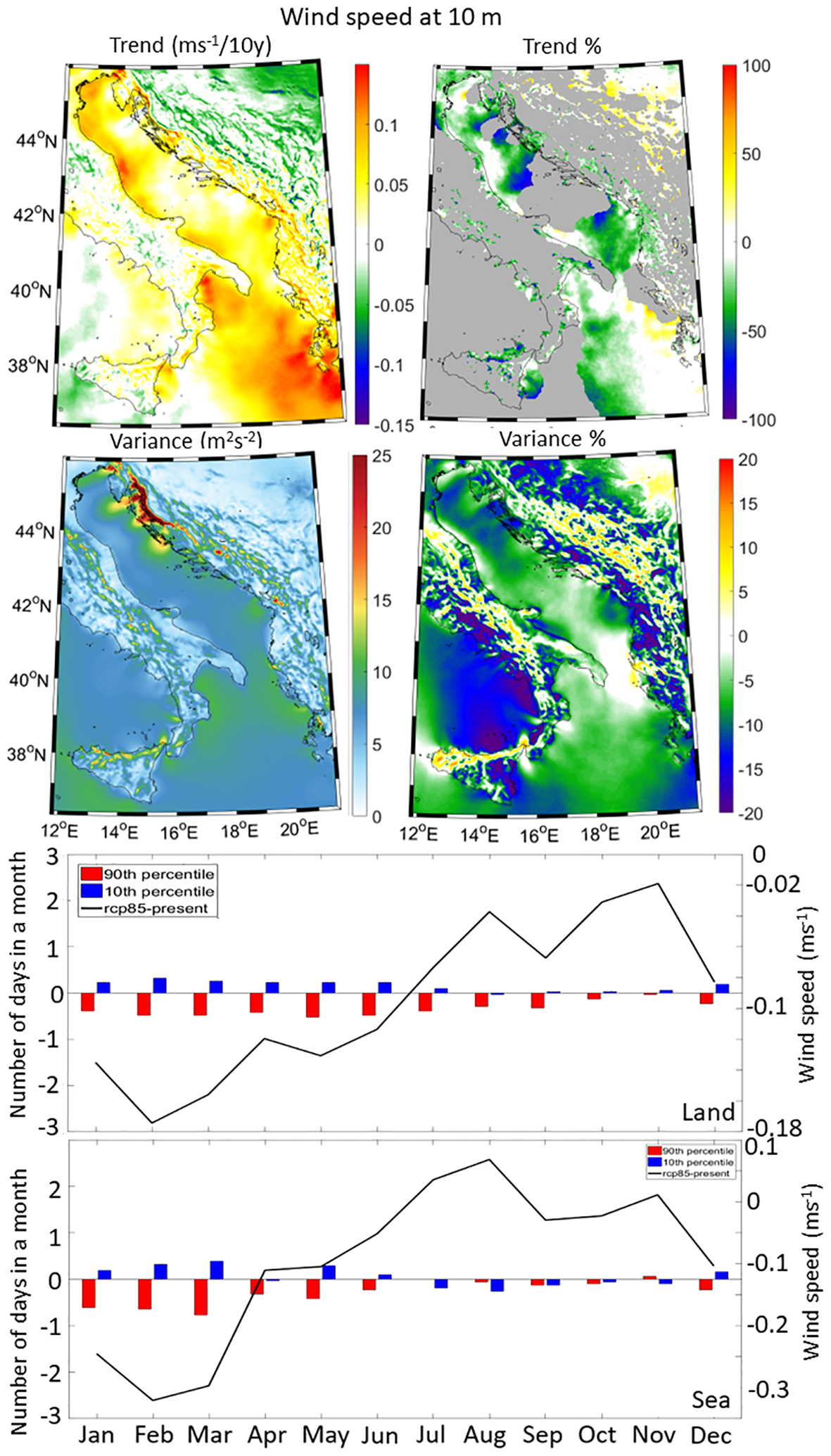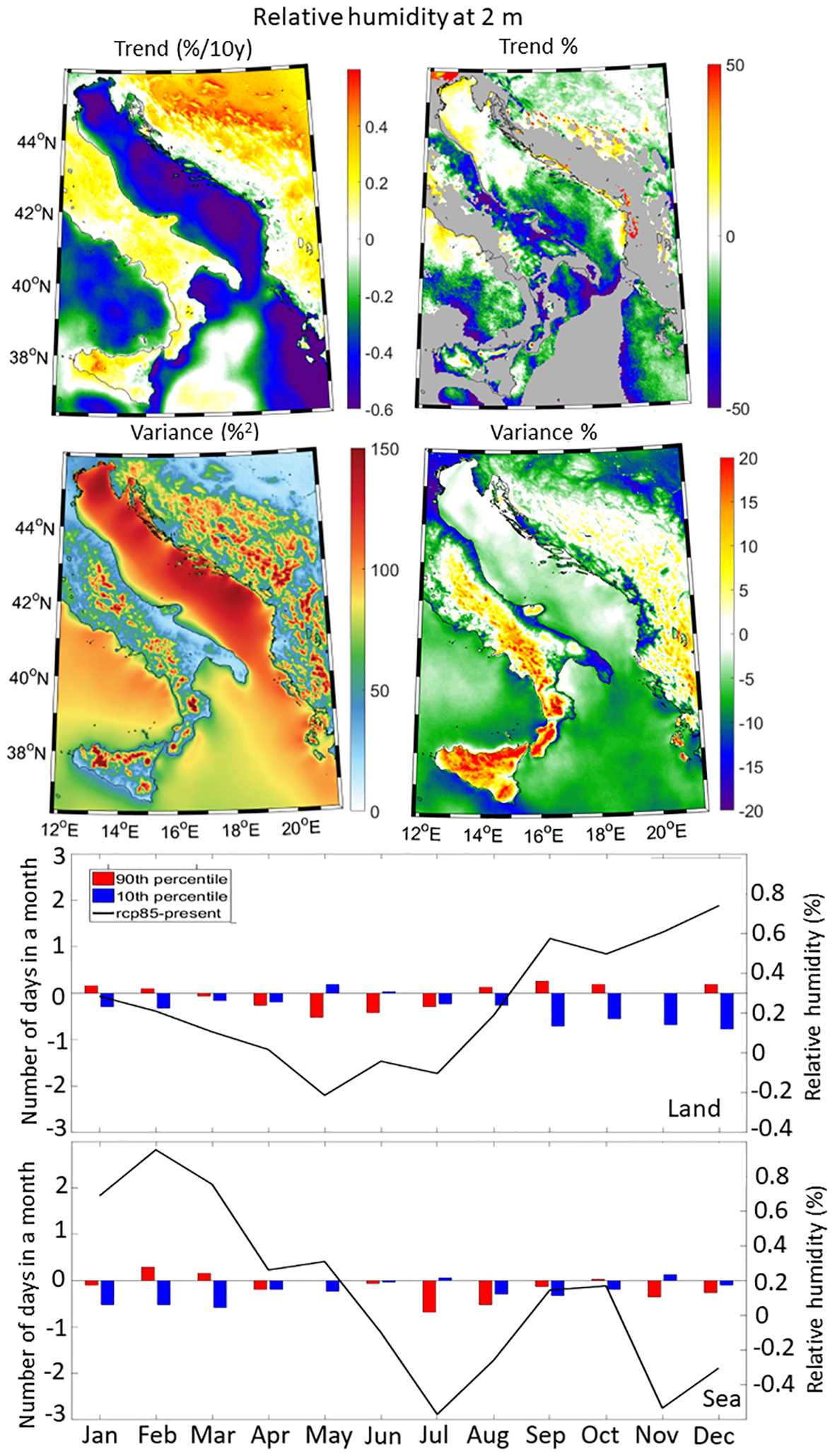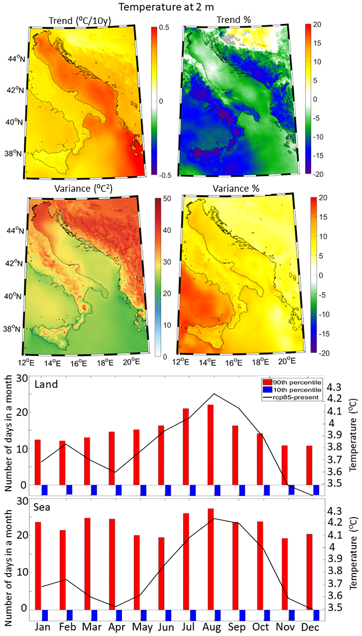 Trend, trend percentage, variance and variance percentage spatial plots (top panels) as well as changes in both monthly average conditions (black line) and number of daily extreme events per month calculated below/above the historical minimum (10th percentile)/maximum (90th percentile) thresholds (bar plots) over the land and sea sub-domains (bottom panels), for the air temperature at 2 m.
