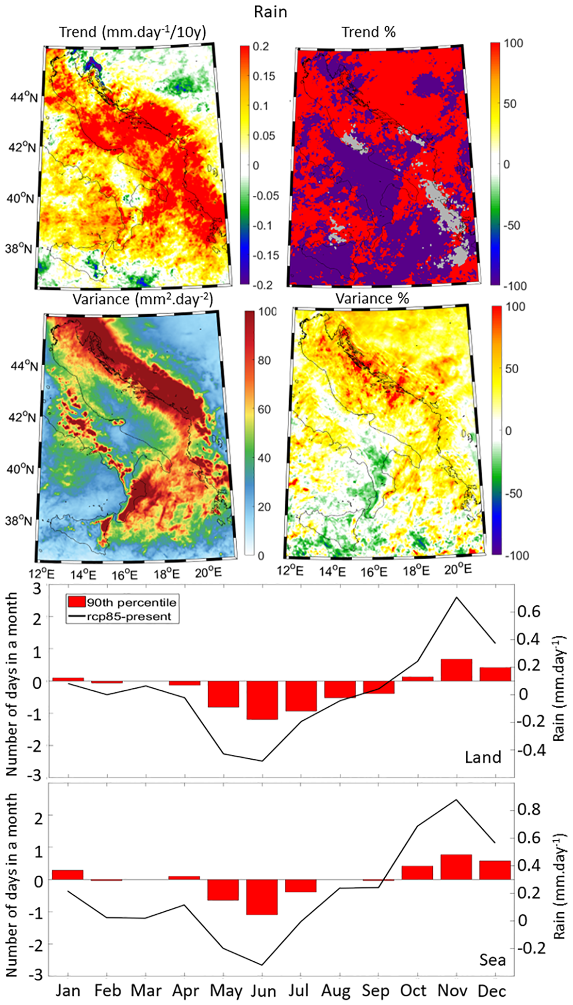 Rain decadal trends in the far-future climate (Figure 4, upper panels) are positive over sea and the coastal regions, except in the Rijeka area where large negative trends are projected (below -0.2 mm/day per decade). Coastal regions along the eastern coast and the northern Adriatic present larger decadal rain trends (up to 0.2 mm/day per decade) than in the rest of the domain (around 0.1 mm/day per decade). South of the Adriatic, trends are lower and mostly decreasing. Rain variance percentages indicate an overall increase of more than 50% in variability. Monthly analysis of rain (Figure 4, lower panels) reveals an increase in days with extreme rainfall in the far-future climate, particularly in October-January. The number of days with extreme rainfall decreases (up to a day per month) during the warm season (May-September) over both land and sea sub-domains, accompanied by an increase in mean rain intensity over the land and sea sub-domains varying between 0.2 and 0.8 mm/day during the cold season (September-January).