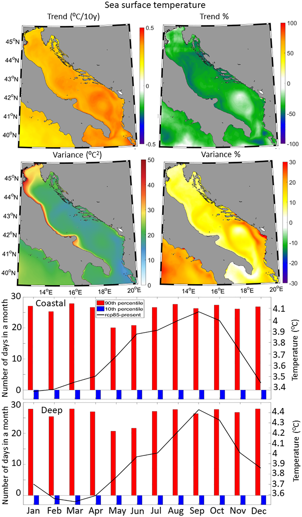 Trend, trend percentage, variance and variance percentage spatial plots (top panels) as well as changes in both monthly average conditions (black line) and number of daily extreme events per month calculated below/above the historical minimum (10th percentile)/maximum (90th percentile) thresholds (bar plots) over the coastal and deep sub-domains (bottom panels), for the sea surface temperature.