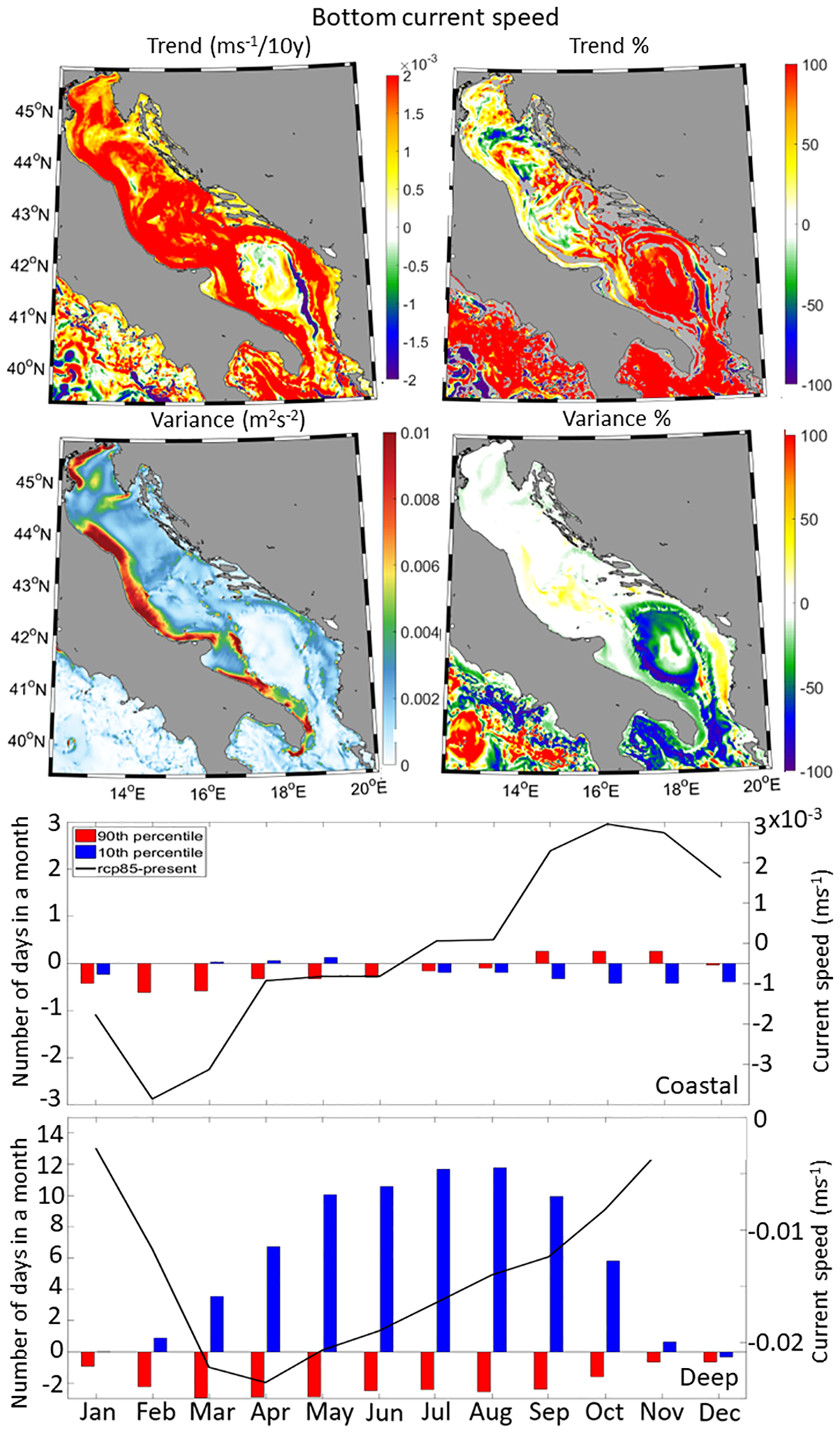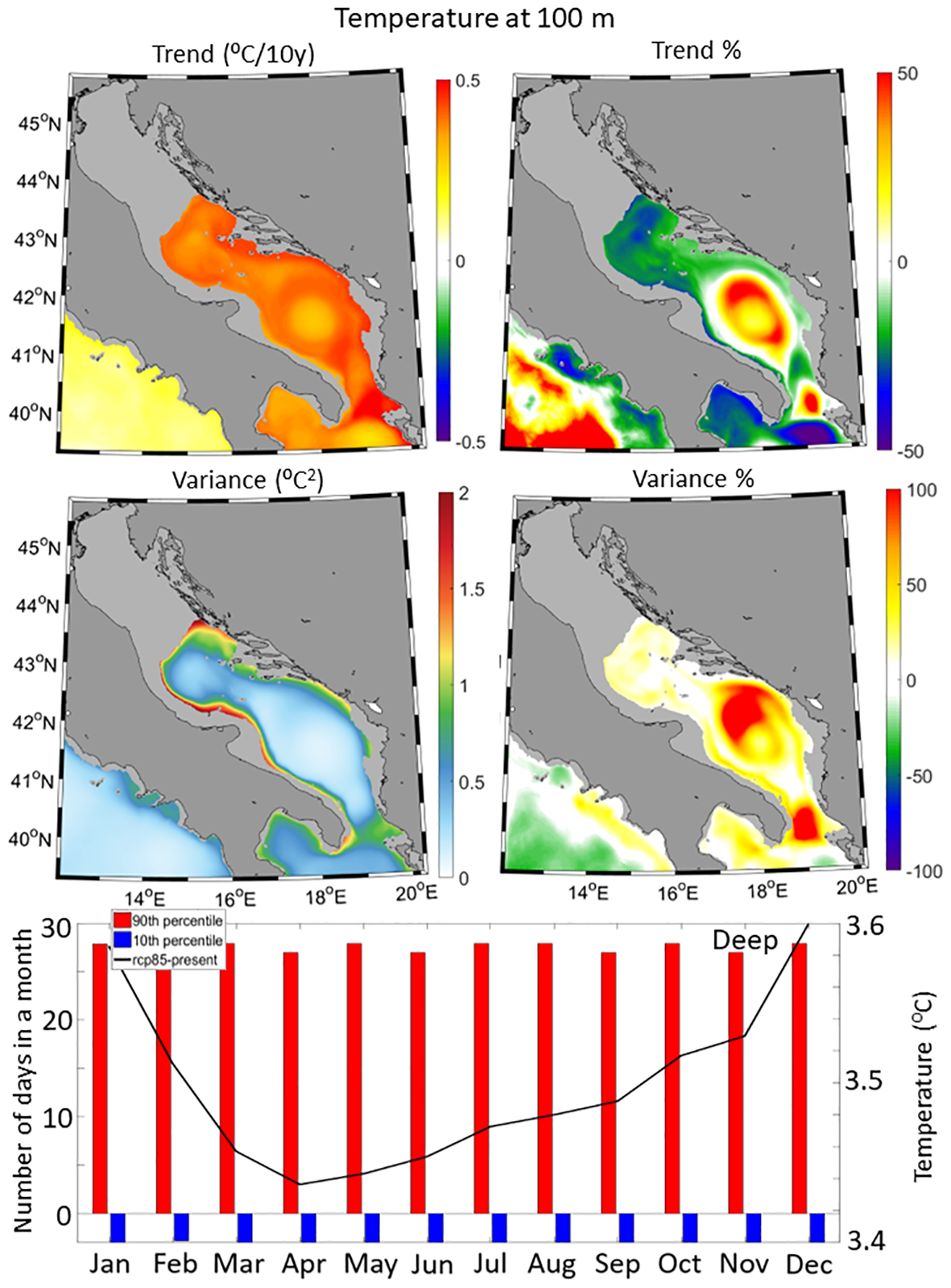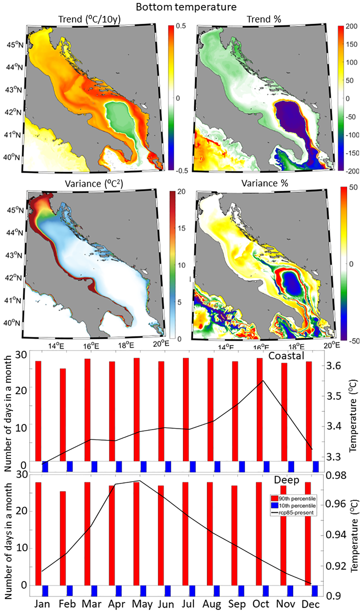 Sea surface temperature trends (Figure 6) predominantly range from 0.25 to 0.35°C per decade, with slightly higher values in the southern than in the northern Adriatic and maximum values at the perimeter of the Southern Adriatic Pit (SAP). Trend percentages (Figure 6) indicate a decrease in sea surface temperature trends in the far-future climate compare to the historical results, mostly around 30%, with higher values of approximately 50% in the central Adriatic and along the western coastal current but lower values below 10% in the SAP. Sea temperature trends at 100 m depth (Figure 7, upper panels) show an increase of approximately 0.4°C per decade. The Otranto Strait experiences the highest warming rates (around 0.5°C per decade), while the SAP shows the lower values (about 0.35°C per decade). Trend percentages indicate a decrease in temperature trends of 25-40% in the central Adriatic and an increase of 25-50% in the SAP and the Otranto Strait compare to the historical results. Decadal trends of sea bottom temperature (Figure 8, upper panels) demonstrate contrasting behavior between the SAP and the rest of the Adriatic Sea. The SAP exhibits negative trends (0.1-0.2°C per decade), while positive trends (up to 0.5°C per decade) are observed elsewhere, with the highest values along the eastern coast and the Dalmatian islands. Trend percentages indicate a general decrease in future sea bottom temperature trends, with the lowest values in the central Adriatic and along the Dalmatian coast and islands, dropping below 20%. Higher percentages are found in the SAP and the Otranto Strait, with trends up to 200% lower than for the historical results. Far-future temperature variability is expected to increase compare to the historical results, by 10-20% at the surface and up to 100% at 100 m in the SAP and the Otranto Strait. Monthly analysis reveals significant changes in sea temperature extremes in the far-future climate. Temperatures below the minimum historical threshold in the historical run no longer occur but temperatures above the maximum historical threshold persist in all months, except May-June when 5-8 days do not exceed this threshold. Differences in monthly climatologies show a sea surface temperature increase in the coastal Adriatic regions ranging from 3.4-3.5°C in winter to 4.1-4.4°C in summer. At 100 m, the increase is of 3.4-3.6°C, more pronounced in winter and less in spring and summer due to seasonal conditions. At the bottom, temperature differences also vary, with coastal areas experiencing similar values to those at 100 m, but significantly lower values in the deep sub-domain, ranging from 0.9 to 1°C.