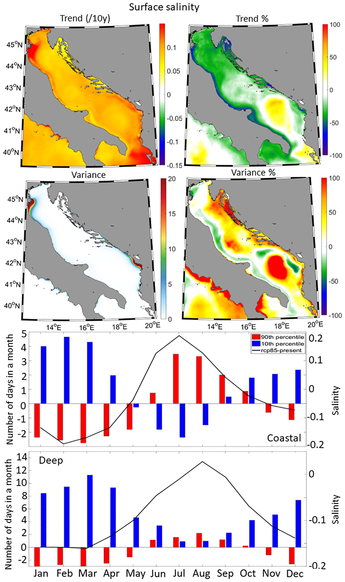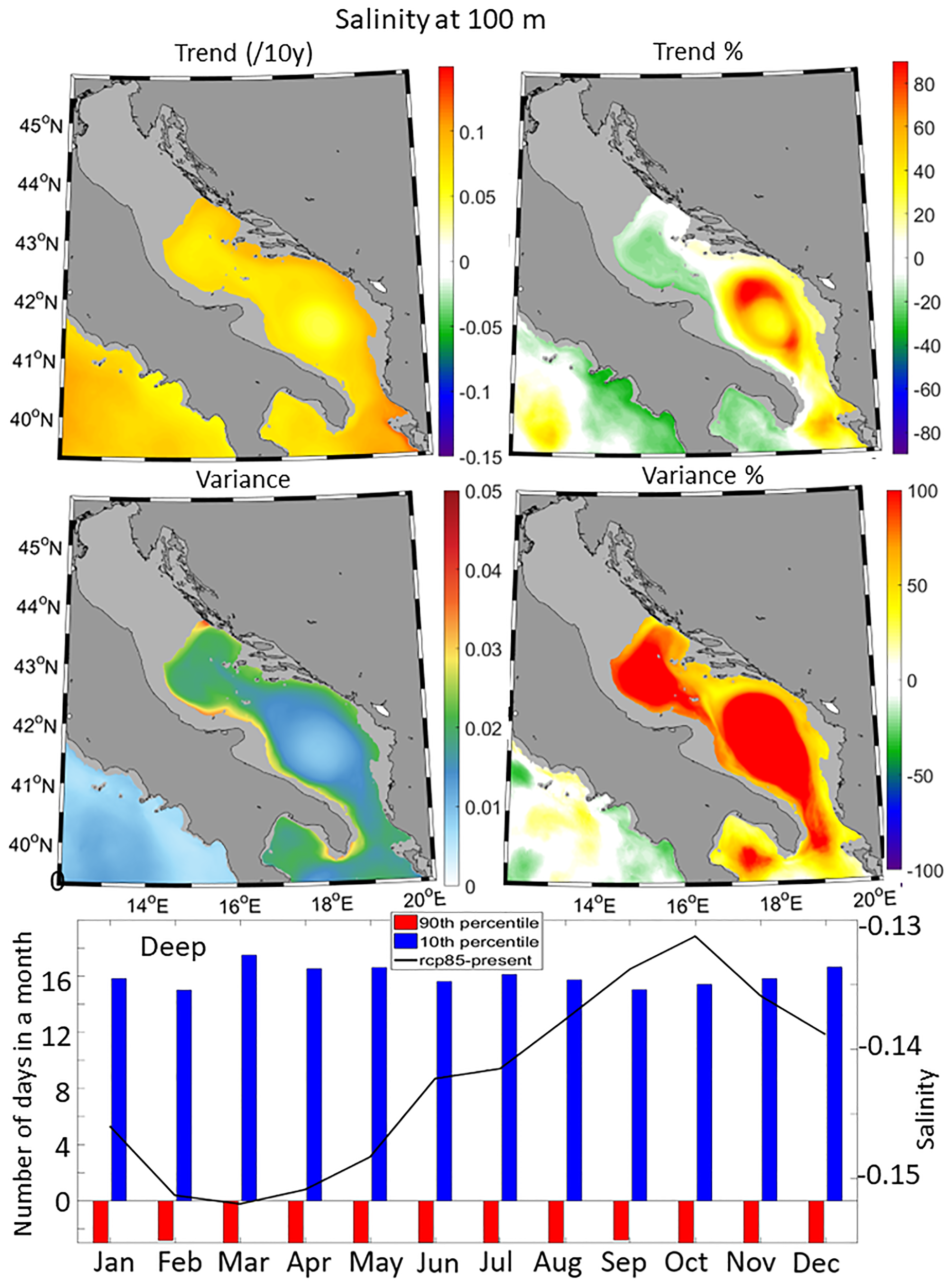 Surface salinity trends (Figure 9 upper panels) generally vary around 0.1 per decade, with slightly lower values in the Kvarner Bay and Dalmatian Island regions (0.05 per decade). Higher salinity trends are observed off the Po River delta (exceeding 0.15 per decade) and in the Otranto Strait. Compared to the historical trends, salinity is expected to increase by approximately 25% in the SAP and the eastern side of the Otranto Strait. Lower salinity trend differences are projected for the rest of the Adriatic, particularly along the Po River plume, the Kvarner Bay coastal area, and the Neretva River delta. At a depth of 100 m (Figure 10), salinity trends range between 0.05 and 0.1 per decade while, compare to the historical trends, far-future trends are expected to decrease by approximately 20% in the western Adriatic region but to increase in the eastern part, especially in the SAP. Variability at 100 m is generally low but is expected to be much larger than in the present climate. Bottom salinity trends (Figure 11 upper panels) are positive, with lower values in deeper regions and higher values in shallower areas, such as the northern Adriatic shelf. Salinity trends decrease along the Po River plume, in the northern Adriatic, and the Kvarner Bay, while they increase in the Southern Adriatic Pit and the Otranto Strait. Bottom salinity variability is projected to decrease in the Southern Adriatic Pit but increase in the rest of the Adriatic. At the surface (Figure 9), differences in the number of days of extreme high salinity events reveal positive changes during summer (up to 3 and 2 days more in the coastal and deep domains, respectively), but negative changes, associated with an average decrease in salinity of up to 0.2, otherwise. At 100 m depth, all differences are negative throughout the year with at least 14 days more of extreme low salinity events than under the historical conditions associated with a decrease in salinity up to 0.15. This clearly indicates lower salinity in the far-future climate, especially during the winter months. At the bottom, differences are negative in the coastal sub-domain leading to at least 4 days more of extreme low salinity events, while in the deep domain, they are positive leading to at least 18 days more of extreme high salinity events. A detailed discussion about the potential impact of climate warming on the salinity budget is presented in Section 4.