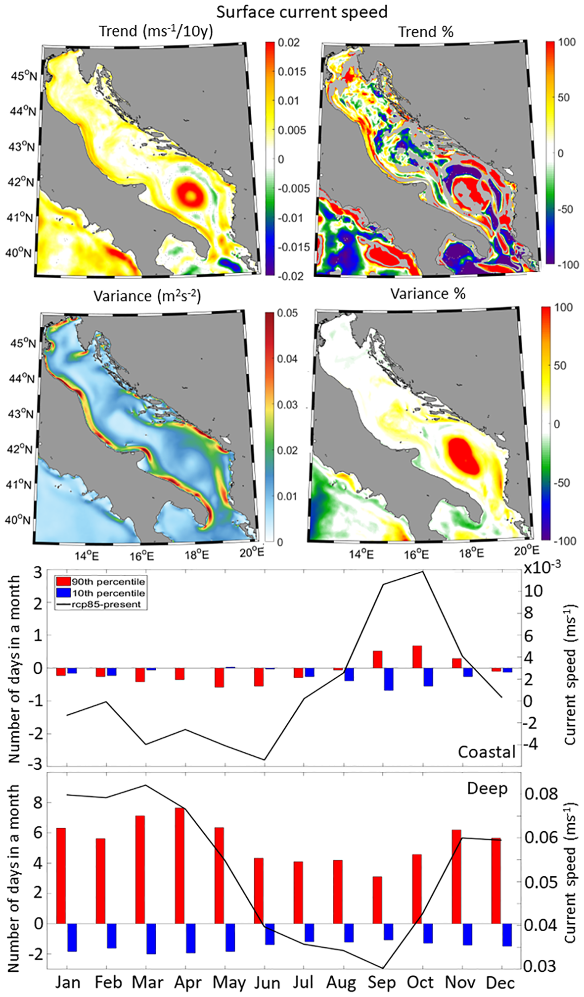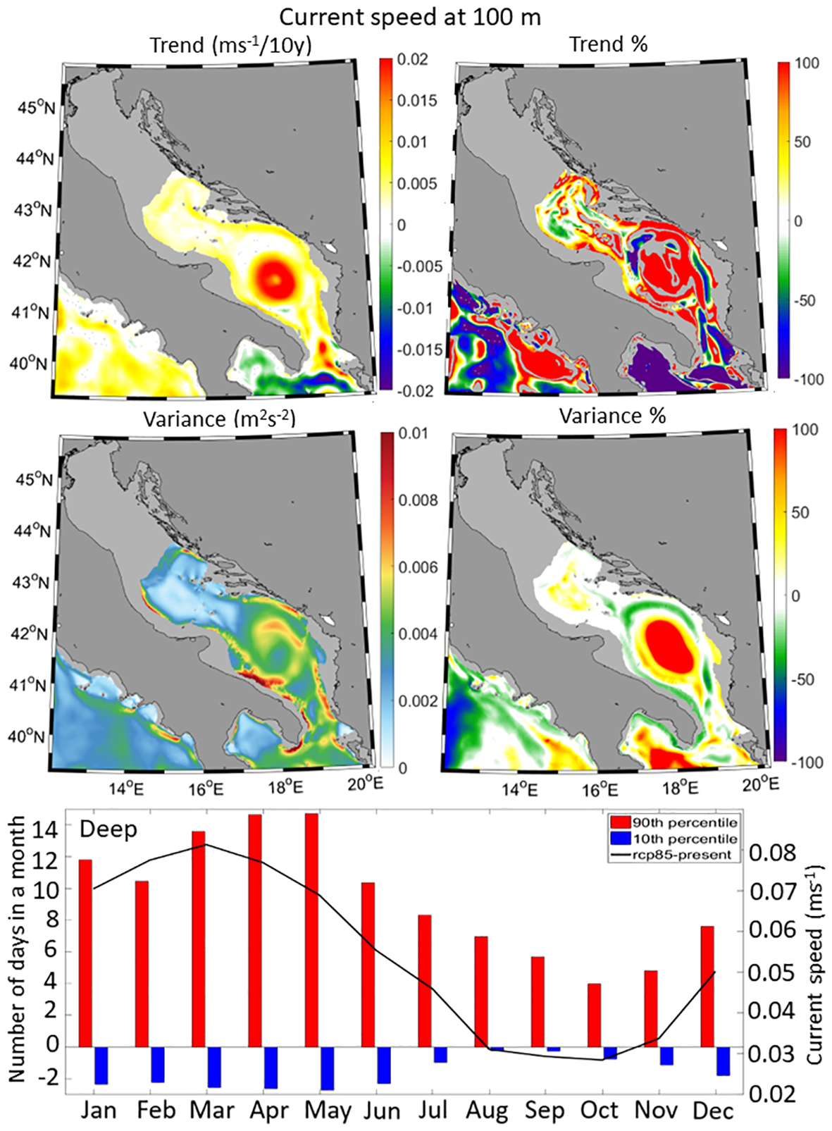 Far-future current speeds in the Adriatic Sea (Figures 12–14) show positive trends across all depths, like it has been documented for the present climate (Tojčić et al., 2023). At the surface (Figure 12), trends range from 0.005 to 0.01 m/s per decade in most areas, except for the SAP, where they reach up to 0.02 m/s per decade in the inner part of the cyclonic gyre and around -0.005 m/s per decade in its outer parts. Compared to historical trends, positive changes are observed in the central SAP, transversely over the northern Adriatic, and along the eastern and western coastal regions. At a depth of 100 m (Figure 13), current speed trends are similar to surface trends, with positive values up to 0.005 m/s per decade, primarily concentrated in the center of the SAP where both trends and variability increase by more than 100%. At the bottom (Figure 14), current speed trends remain generally low, below 0.002 m/s per decade, with the lowest values in the SAP. Compared to the historical trends, a strong increase in trends (more than 100%) associated with a strong decrease in variability (up to 100%) is expected in the SAP and the Otranto Strait. Monthly analysis of surface current speeds indicates a significant increase in the deep domain during wintertime, while summer months show lower increases. Consequently, the number of days with extreme high surface current speeds will double or triple in the deep domain in the far-future climate, while weak surface current events will be decrease by half. At 100 m depth, mean current speeds will increase, particularly in January-May, with almost half of the month characterized by extreme high current speeds. At the bottom, the deep domain will experience a weakening of the currents, particularly in summer when up to 11 days more of extreme weak events per month are expected to occur compared to the historical conditions. In the coastal domain, the changes in current speed are mostly negligible.