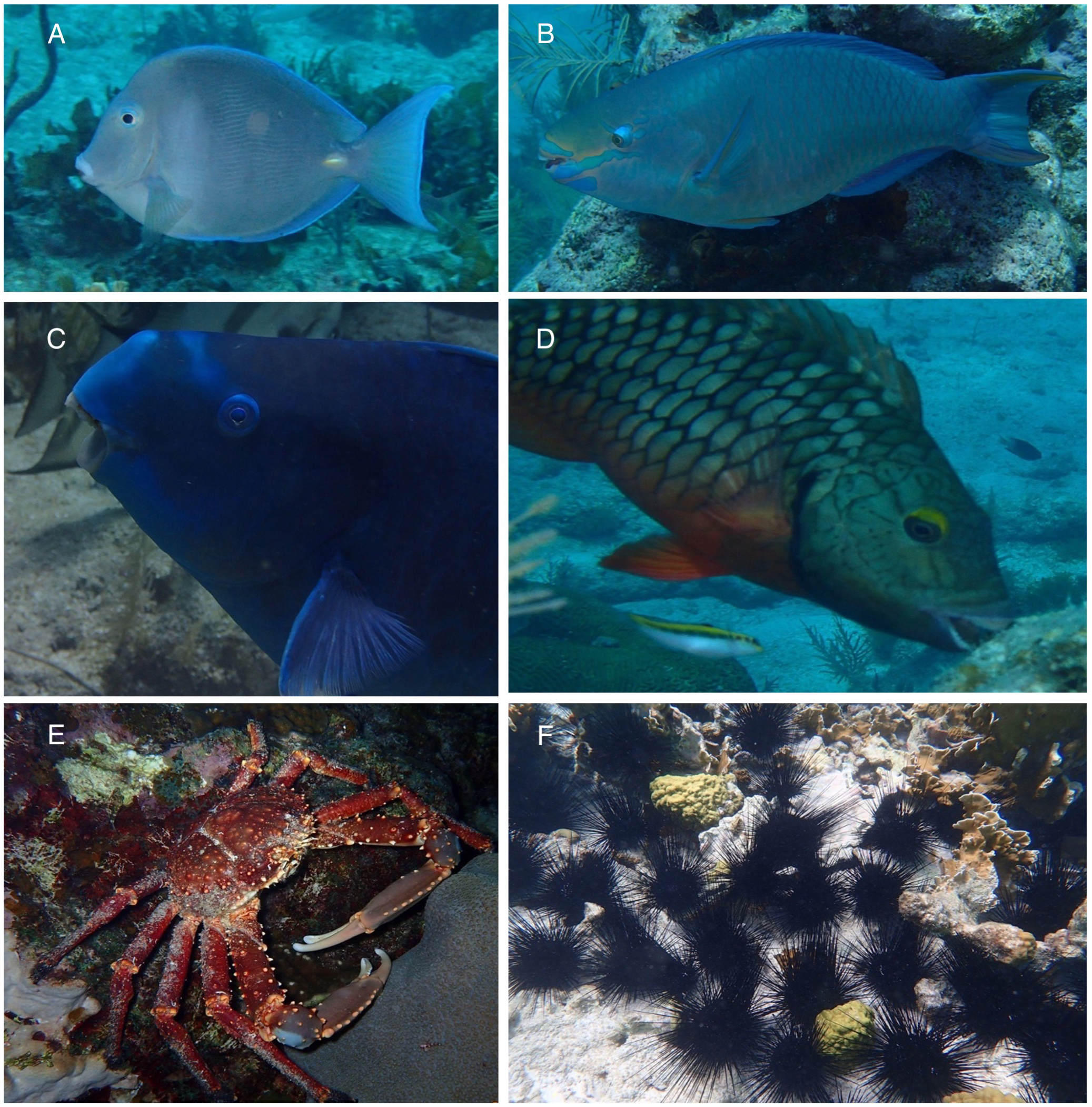 Photos of common Caribbean reef herbivores. (A) Blue Tang, Acanthurus coeruleus; Acanthuridae (photo credit: Alain Duran). (B) Queen Parrotfish, Scarus vetula; Scaridae (photo credit: Alain Duran). (C) Blue Parrotfish, Scarus coeruleus; Scaridae (photo credit: Alain Duran). (D) Stoplight Parrotfish (initial phase), Sparisoma viride; Scaridae (photo credit: Alain Duran). (E) Caribbean King Crab, Maguimithrax spinosissimus; Mithracidae (photo credit: AJ Spadaro). (F) Long-spined Sea Urchin, Diadema antillarum; Diadematidae (photo credit: Alwin Hylkema).