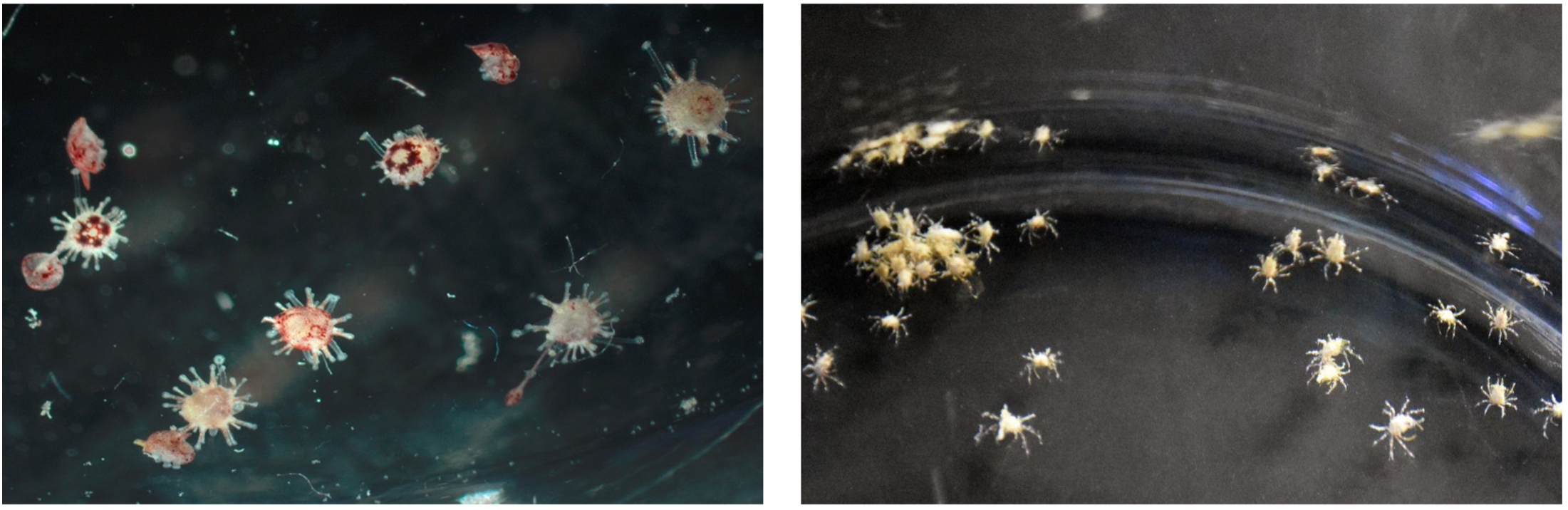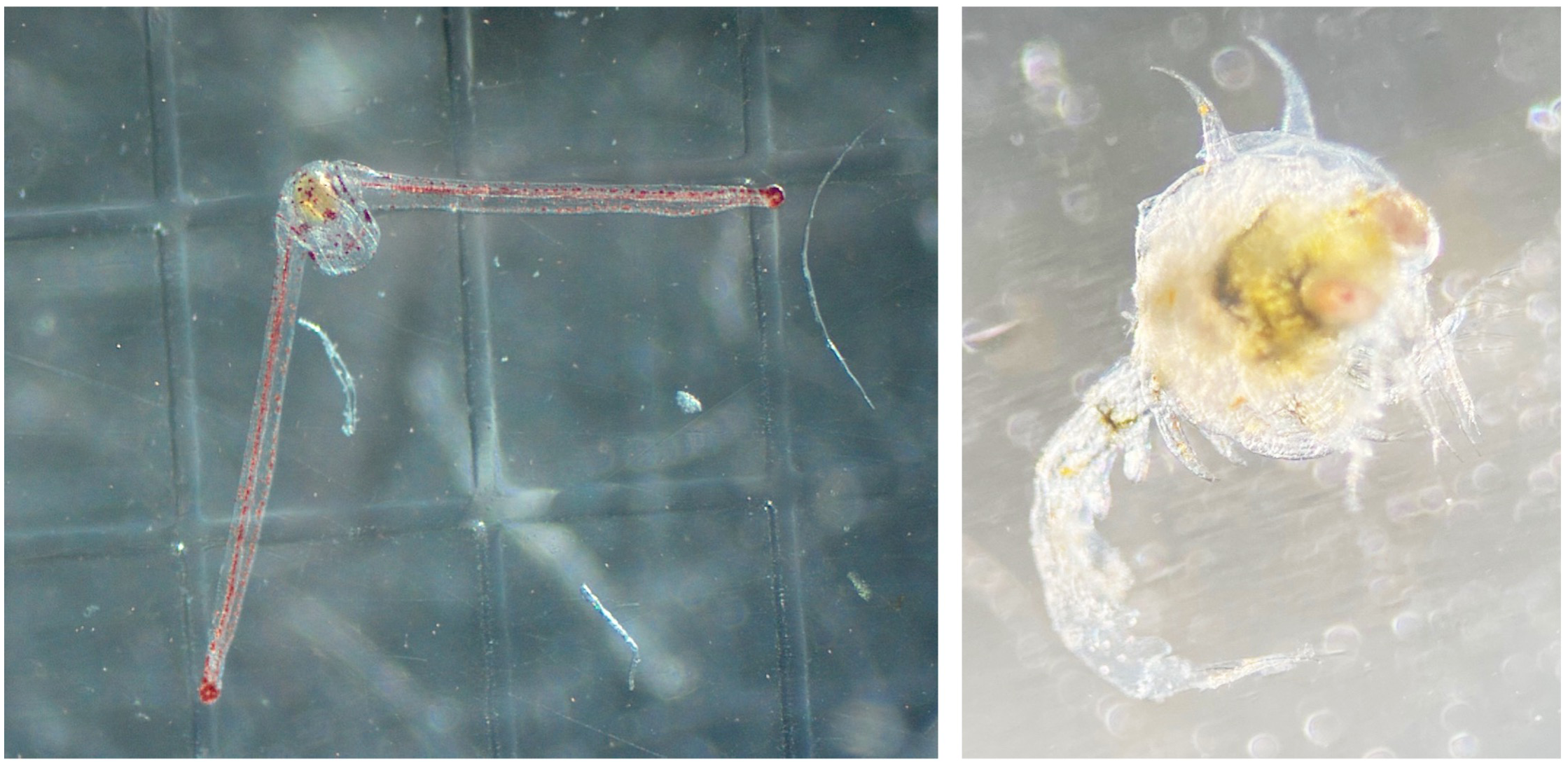 (Left) Photo of a D. antillarum echinopluteus larva reared in the laboratory (photo credit: A. Hylkema). (Right) Photo of a M. spinosissimus megalopa larvae reared in the laboratory (photo credit: L. Cifers).