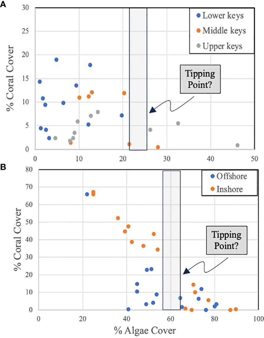Coral reef degradation often manifests in a dramatic phase shift in benthic taxonomic dominance from corals to fleshy macroalgae (Done, 1992; Mumby, 2006a). This change, at least on Caribbean reefs, appears to represent a shift to an alternate stable state (Mumby and Steneck, 2008; Mumby et al., 2013). Macroalgae are natural components of coral reef ecosystems that serve beneficial ecological functions (Ortega et al., 2019; Fulton et al., 2020), but their overgrowth of reefs is indicative of degradation (Morand and Briand, 1996). Competition with macroalgae has a range of negative consequences for coral demographics, among them: reduced fecundity, inhibition of recruitment, suppression of growth, and reduced survival, all with deleterious cascading effects on ecosystem health (Rasher et al., 2011; Rasher and Hay, 2014; van Woesik et al., 2018; Monteil et al., 2020; Smith et al., 2022). The negative effects of macroalgae on corals result from direct interactions (e.g., shading, space pre-emption) as well as indirect mechanisms such as allelopathy (Birrell et al., 2008). Furthermore, once a reef becomes macroalgal dominated, a range of feedback mechanisms make it difficult for a reef to recover (Mumby and Steneck, 2008). For example, loss of three-dimensional structure limits grazing fish abundances, and fishes may avoid reef areas with high macroalgal density because of predation risks (Hoey and Bellwood, 2011; Dell et al., 2016; Davis, 2018). Thus on macroalgal-covered reefs, the sustainability of corals and their resilience to disturbance are compromised, particularly in the Caribbean (Mumby et al., 2007a; Roff and Mumby, 2012).