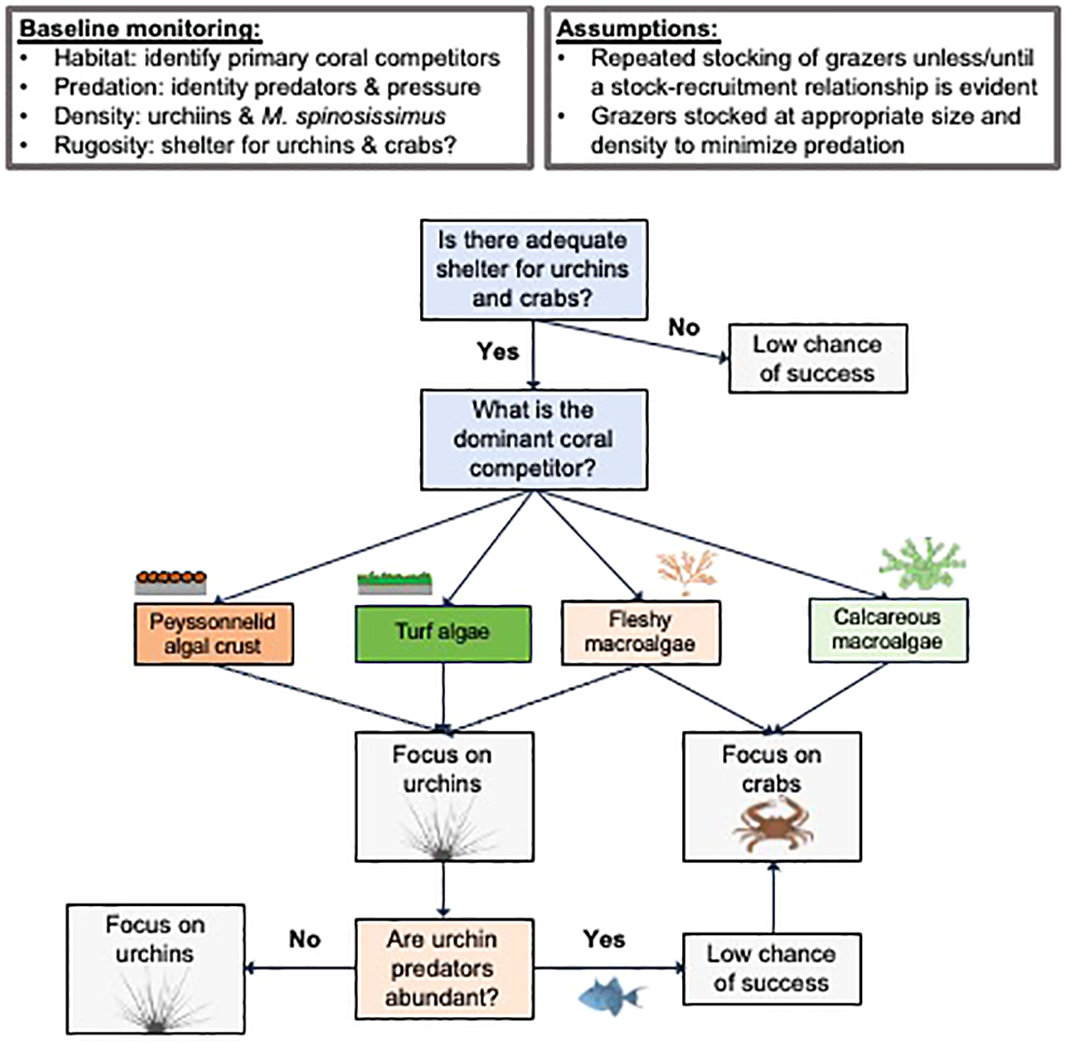 In short, absent the proper benthic habitat conditions, the transplantation of corals to ‘jump-start’ reef recovery is doomed to failure (Arnold and Steneck, 2011). In response to this challenge, restoration science turned to two complementary objectives to increase reef herbivory: (1) regulate and better manage the fishing of piscine herbivores, and (2) restock invertebrate herbivores where their abundance has diminished. The latter alternative naturally centered on the re-establishment of D. antillarum, whose density in most locales never recovered to pre die-off levels (Lessios, 2016). In recent years, the potential importance of herbivory by a suite of other reef invertebrates has emerged, including urchins other than D. antillarum and a guild of herbivorous crabs in the Mithracidae family (Coen, 1988a, 1988b; Stachowicz and Hay, 1999a; Butler and Mojica, 2012; Francis et al., 2019; Spadaro and Butler, 2021; Zeinert et al., 2021). These findings have naturally led to consideration of invertebrate herbivores as agents of reef recovery through stock enhancement.