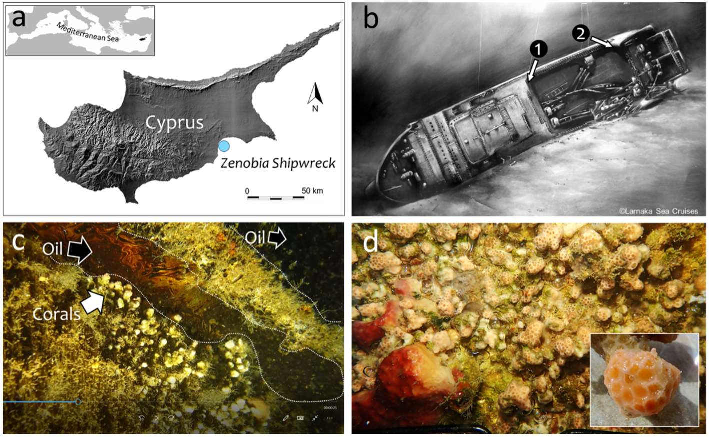 Epibenthic communities from shipwrecks are studied intensively due to the characteristics that make the wreck an artificial reef. Knowledge about the ecological processes operating on these assemblages (e.g., recruitment, competition, predation) assist in the elaboration of management options for the restoration of degraded habitats, population dynamics of invasive species, to concentrate human activities in specific areas, and more often than not, for the enhancement or creation of habitat (Brockinton et al., 2022; Hughes et al., 2023). Behind the apparent benefits of shipwrecks to the general biodiversity of an area, that is, by providing free substrate for epibenthic species that are fast and successful colonizers (Hoeksema et al., 2023) and refuge for mobile species increasing thus the biodiversity (Monchanin et al., 2021), wrecks might also contribute to local pollution by leaking chemicals (e.g., van der Schyff et al., 2020). Such is the case with Zenobia shipwreck in Cyprus, where rich epibenthic communities of corals and sponges live closely related to chronic leakage of oil, noticeable in various sections of the wreck’s structure (Jimenez et al., 2017a).