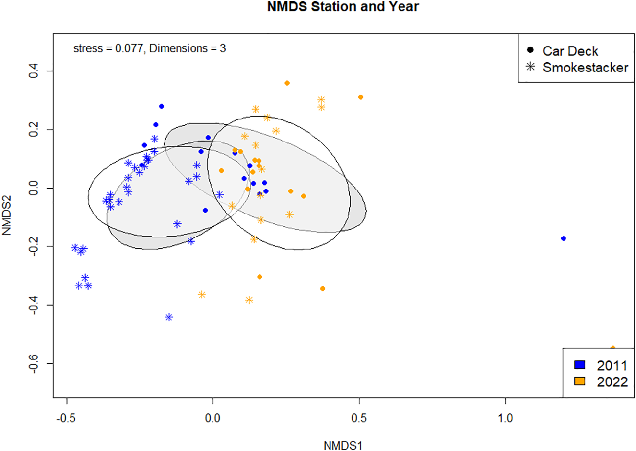 metaMDS ordination with Bray Curtis Dissimilarity distance calculation comparing community composition between stations and years.