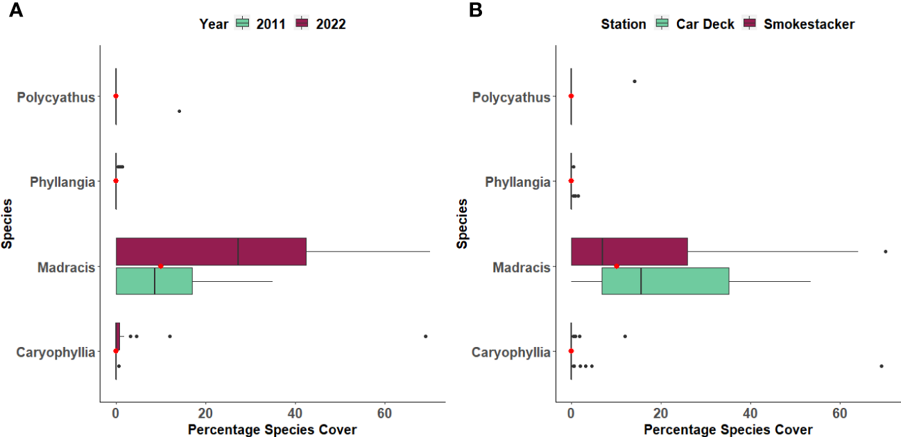 Percentage cover of four coral species across (A) Years and (B) Stations. The boxplots indicate the median (horizontal line), interquartile range (boxes), minimum/maximum values (whiskers), outliers (black points), as well as the combined median of both groups (red point).