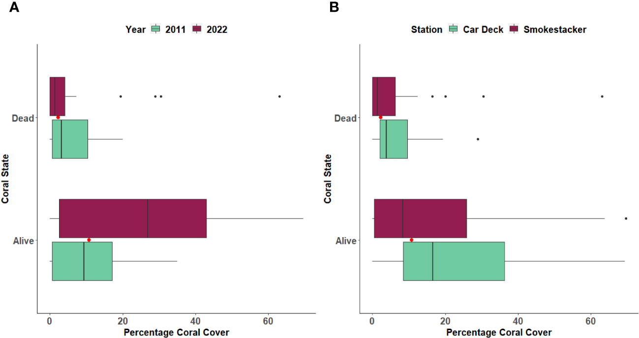 Percentage of cover of Dead and Living corals between (A) Years and (B) Stations. The boxplots indicate the median (horizontal line), interquartile range (boxes), minimum/maximum values (whiskers), outliers (black points), as well as the combined median of both groups (red point).