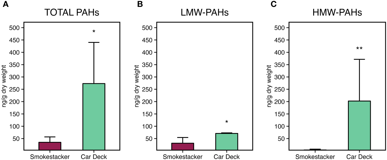 Bioaccumulation of (A) total PAHs, (B) low molecular weight PAHs, and (C) high molecular weight PAHs, in M. pharensis samples collected from Smokestacker and Car Deck sites, respectively. Results are given as mean ± standard deviation (n=4), asterisks denote significant differences between the two sites (*: p < 0.05; **: p < 0.01; ***: p < 0.001).