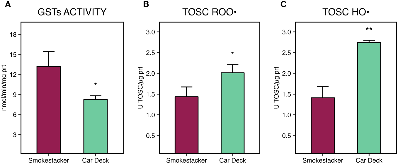 Glutathione S-transferases (GSTs) activity (A), total oxyradical scavenging capacity (TOSC) towards peroxyl (B) and hydroxyl radicals (C), in M. pharensis samples collected from Smokestacker and Car Deck sites, respectively. Results are given as mean ± standard deviation (n=4), asterisks denote significant differences between the two sites (*: p < 0.05; **: p < 0.01; ***: p < 0.001).