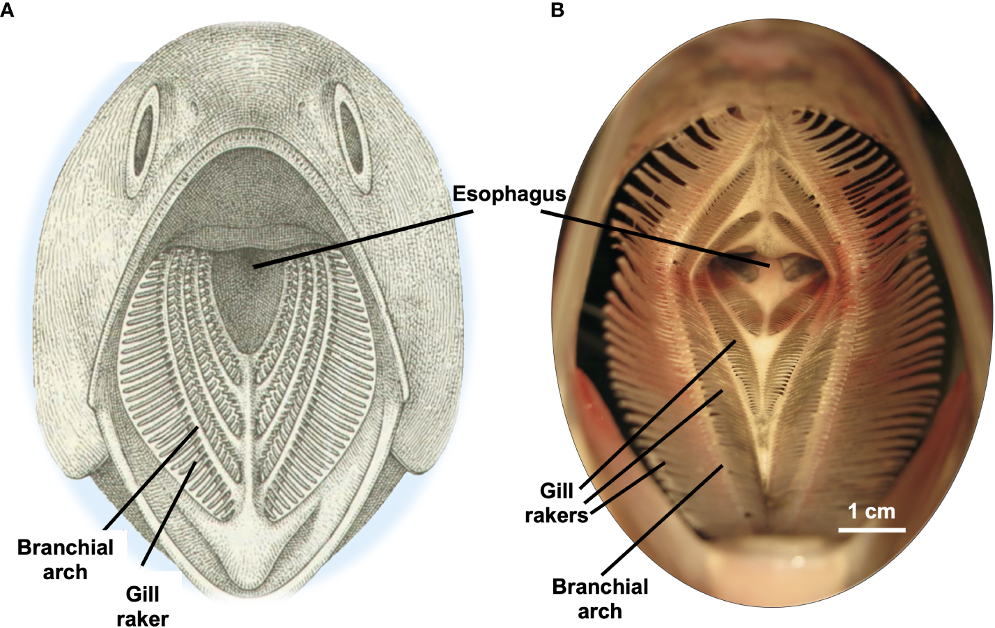 Examples of SF fish oral cavities shown in frontal view, illustrating branchial arches with gill rakers extending laterally from each branchial arch. (A) Generalized SF fish. Modified from Sanderson and Wassersug (1990), with permission. (B) American shad, Alosa sapidissima, Clupeidae. Modified from Witkop et al. (2023), CC BY 4.0.