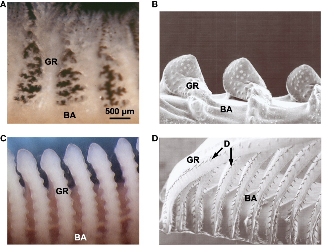 Examples of gill rakers in SF fish species belonging to three orders, shown in frontal view. (A) Pump SF Sacramento blackfish, Orthodon microlepidotus, Cyprinidae, Cypriniformes (fresh specimen). (B) Pump SF Singida tilapia (ngege), Oreochromis esculentus, Cichlidae, Cichliformes (scanning electron microscopy, SEM). (C) Pump SF goldfish, Carassius auratus, Cyprinidae, Cypriniformes (fresh specimen). (D) Ram SF American shad, Alosa sapidissima, Clupeidae, Clupeiformes (SEM). 500 µm scale bar refers to all images. BA, branchial arch; D, denticles; GR, gill raker.
