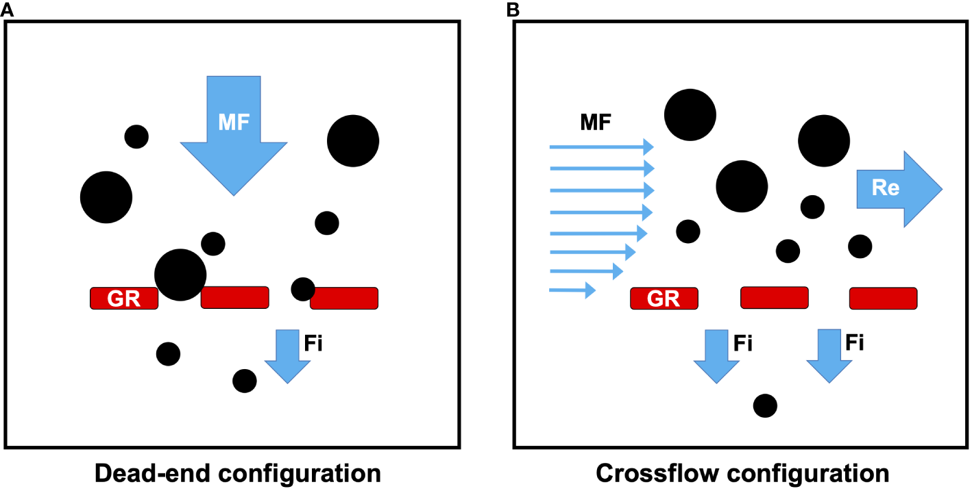 Dead-end has been the conventional configuration hypothesized for SF fishes (Gerking, 1994; Ross, 2013). In dead-end filtration (Figure 4A), the fluid to be filtered travels approximately perpendicular (approximately orthogonal or “normal”, i.e., ~ 90 degrees) to the filter medium, such that there are two streams of fluid: (1) the mainstream flow (i.e., the freestream flow or feed flow of unfiltered fluid) that approaches the GRs and (2) the filtrate (i.e., permeate) that has passed between the GRs. Filtrate is forced between the GRs by higher pressures inside the oral cavity relative to the opercular cavities. In the dead-end configuration, particles are trapped on the GRs when the particles are too large to pass through the gaps (pores) (Rubenstein and Koehl, 1977; LaBarbera, 1984; Shimeta and Jumars, 1991). Therefore, hypotheses for particle separation mechanisms using dead-end filtration in SF fishes are limited to sieving of particles that are equal to or larger than the pore size and/or mucus entrapment of particles with sizes that can be less than the pore size.