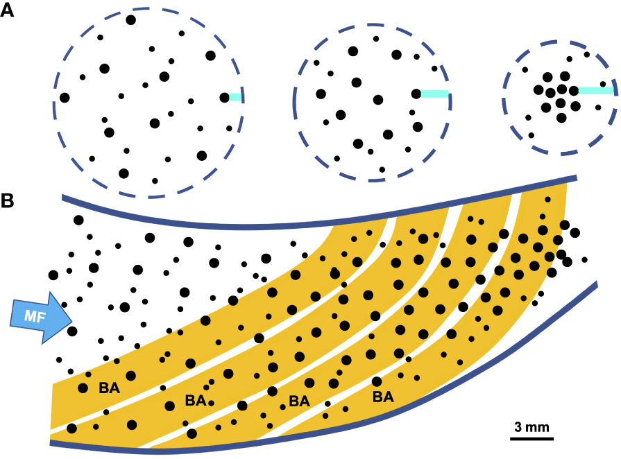 Crossflow filtration is also known as tangential filtration because the flow approaching the GRs travels tangentially or approximately parallel to the GRs, i.e., along and over the GRs inside the oral cavity. Hamann et al. (2023) proposed the term “semi-cross-flow filtration” to differentiate crossflow configurations in which the tangential flow is between 0 and 90 degrees. During crossflow filtration, higher pressure inside the oral cavity of SF fishes (relative to the pressure of the fluid that is located immediately external of the GRs) causes filtrate to exit between the GRs. However, particles can be carried posteriorly in crossflow along the GRs of SF fishes, resulting in the formation of a retentate or concentrate of particles suspended in a limited volume of water near the terminus of the oral cavity (Brainerd, 2001; Sanderson et al., 2001). Due to the tangential flow across the GRs during crossflow filtration, particles can be retained inside the oral cavity using particle separation mechanisms other than or in addition to sieving and mucus entrapment.