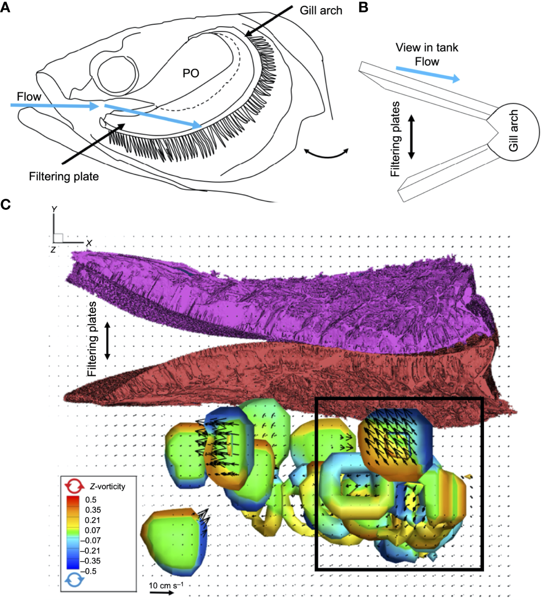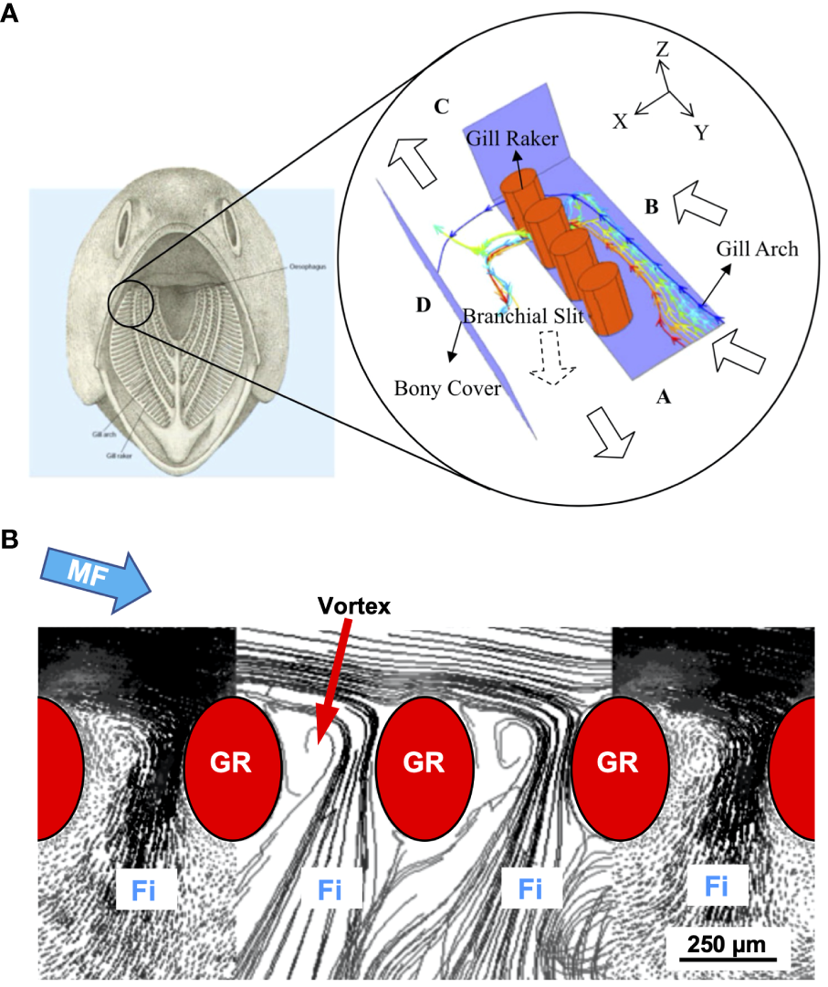 Suspension-feeding (SF) fishes are of substantial ecological and economic importance. Because they feed on small suspended particles such as phytoplankton, zooplankton, and detritus but serve as prey for larger predatory fish, birds, and mammals, SF fishes are key components of marine and freshwater food webs. Approximately 25% of the annual global fish harvest is composed of SF fishes (FAO, 2021). SF fish species have been subjects of recent concern regarding microplastics in the food chain (e.g., Savoca et al., 2020; Misic et al., 2022). Biomanipulation to improve the quality of inland waters has involved the introduction or the removal of SF fishes (review in Lürling and Mucci, 2020). In addition, biomimetic and bioinspired solutions for separation technology and water filtration are topics of intense current interest (Goel et al., 2021; Bianciardi and Cascini, 2022; Hamann and Blanke, 2022; Zhang et al., 2022b). Recent discoveries of particle separation mechanisms in SF fishes have stimulated the development of biomimetic models with potential applications in microfluidics and commercial and industrial filtration for foods and beverages, wastewater, irrigation, oil spill remediation, and biotechnology products (e.g., Dou et al., 2017; Schroeder et al., 2019; Clark and San-Miguel, 2021; Adelmann et al., 2022; Masselter et al., 2023; Xu et al., 2023).