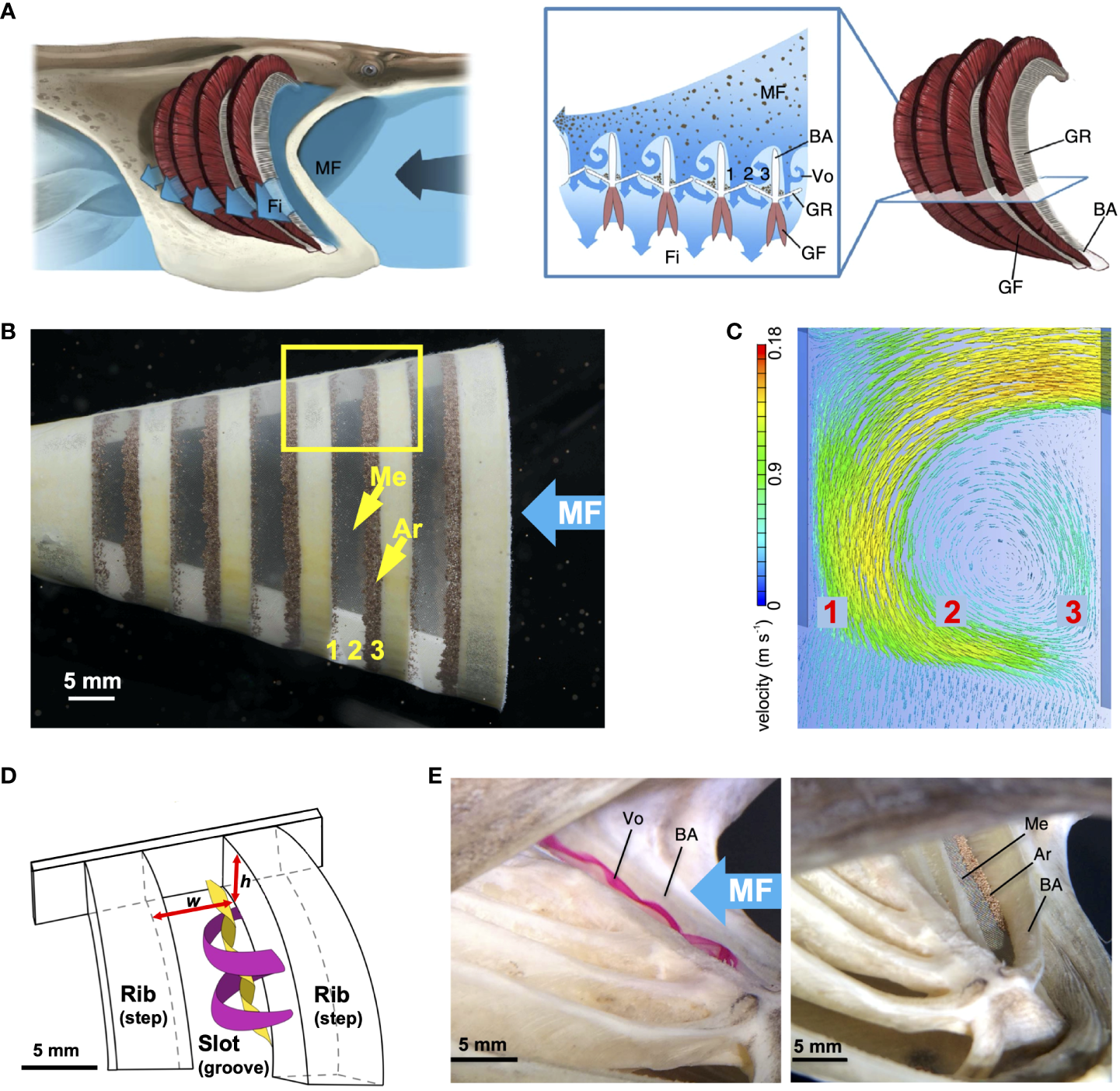 Unlike many subphyla or phyla of SF invertebrates (Hentschel and Shimeta, 2019), all SF fishes are active rather than passive suspension feeders, i.e., actively generate a flow of water into and through their oral cavity. In addition, the filter elements of SF fishes are completely enclosed within a roughly conical oral cavity (Cheer et al., 2001; Sanderson et al., 2016; Brooks et al., 2018; Witkop et al., 2023), which serves as the equivalent of the channel or pipe in industrial filtration and microfluidics. Active SF using an enclosed filter medium results in the potential ability to (a) control and adjust pore sizes as well as flow speed and direction along and between the filter elements (e.g., Sanderson et al., 1991; Provini et al., 2022), (b) control the pressure differential across the filter (e.g., Haines and Sanderson, 2017; Divi et al., 2018), and (c) employ particle separation mechanisms that require flow in pipes and channels for optimal operation (e.g., Sanderson et al., 2001; Cheer et al., 2012; Sanderson et al., 2016; Divi et al., 2018; Witkop et al., 2023), as discussed further below.