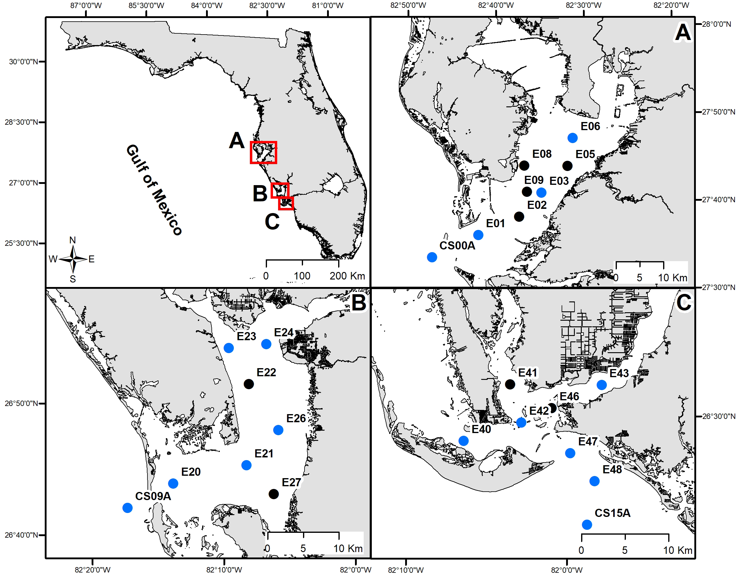 Estuarine (quarterly) sampling stations in (A) Tampa Bay, (B) Charlotte Harbor, and (C) the Caloosahatchee River. Blue dots represent locations where the full suite of carbonate chemistry variables and nutrients were measured, black dots represent locations where only cell counts were collected.