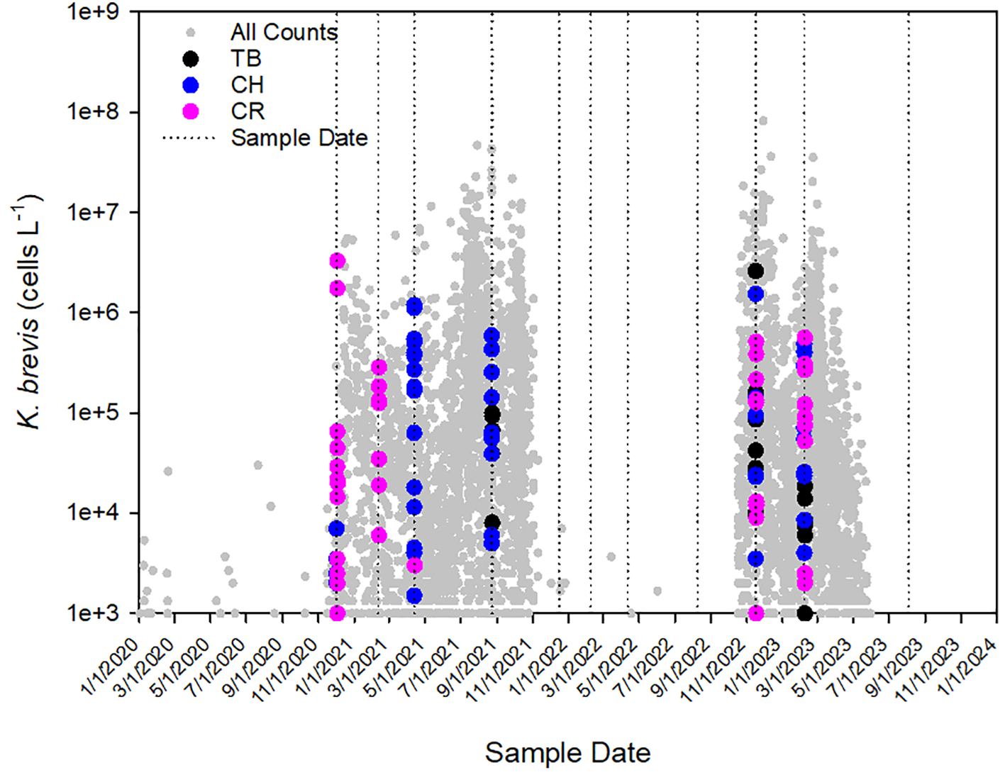 Cell counts of Karenia brevis in Tampa Bay (TB), Charlotte Harbor (CH), and the Caloosahatchee River (CR) during the period January 2020 to August 2023. Small gray symbols represent all K. brevis cell counts collected in the Florida Southwest Region during the same time period. Dotted lines represent sample dates.