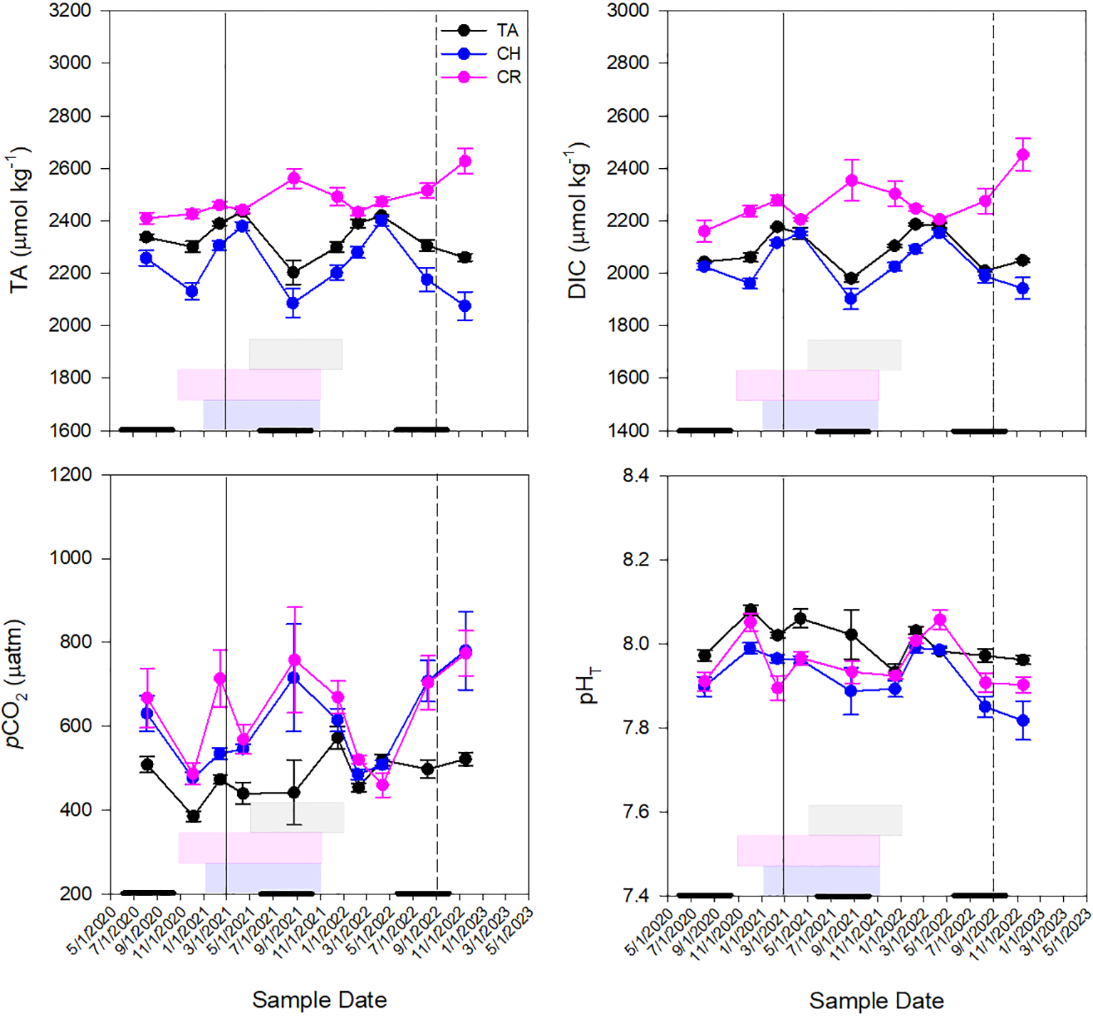 Seasonal patterns of mean pHT, pCO2, dissolved inorganic carbon (DIC) and total alkalinity (TA) concentrations at all stations throughout the sampling period in Tampa Bay [TB; n=99], Charlotte Harbor [CH; n=124], and the Caloosahatchee River [CR; n=128]. Solid vertical lines represent Piney Point legacy mining release (in Tampa Bay, March 2021) and dashed vertical lines represent Hurricane Ian (September 2022). Gray boxes represent K. brevis bloom conditions in TB, pink boxes represent K. brevis bloom conditions in CH and blue boxes represent K. brevis bloom conditions in CR. Thick black lines along the x-axis represent the wet season in the west coast of Florida (June 1-October 31).