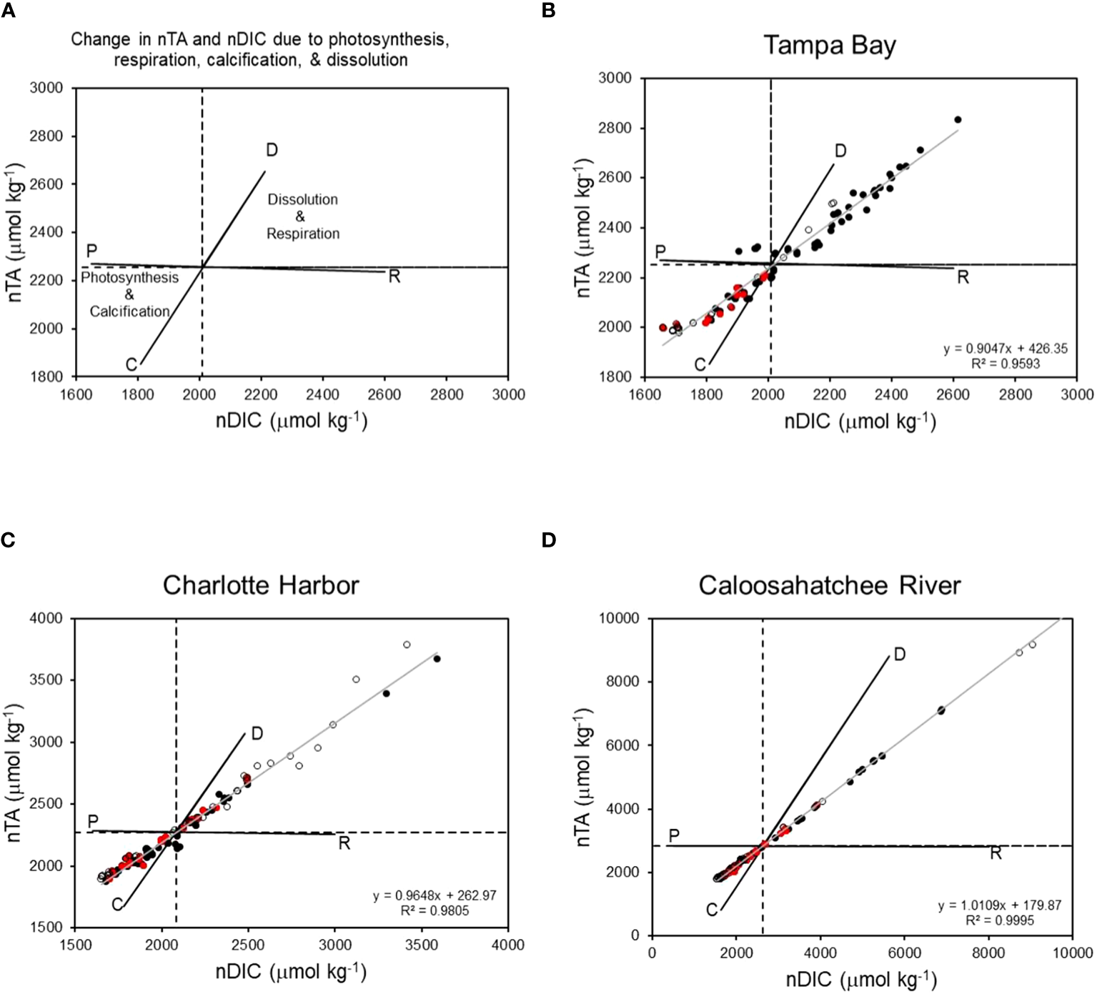 (A) Theoretical change in nTA and nDIC resulting from photosynthesis (P), respiration (R), calcification (C), and dissolution (D). Linear relationships between nTA and nDIC in Tampa Bay (B), Charlotte Harbor (C), and the Caloosahatchee River (D). Points in upper right quadrant indicate carbonate dissolution and respiration were dominant processes. Points in lower left quadrant indicate photosynthesis and calcification were dominant processes. Dashed lines indicate mean nTA and nDIC in each estuary. Gray line indicates linear regression for all data. Solid black circles = dry season; open black circles = wet season; red circles = Karenia brevis present during the dry season (no border) or wet season (black border).