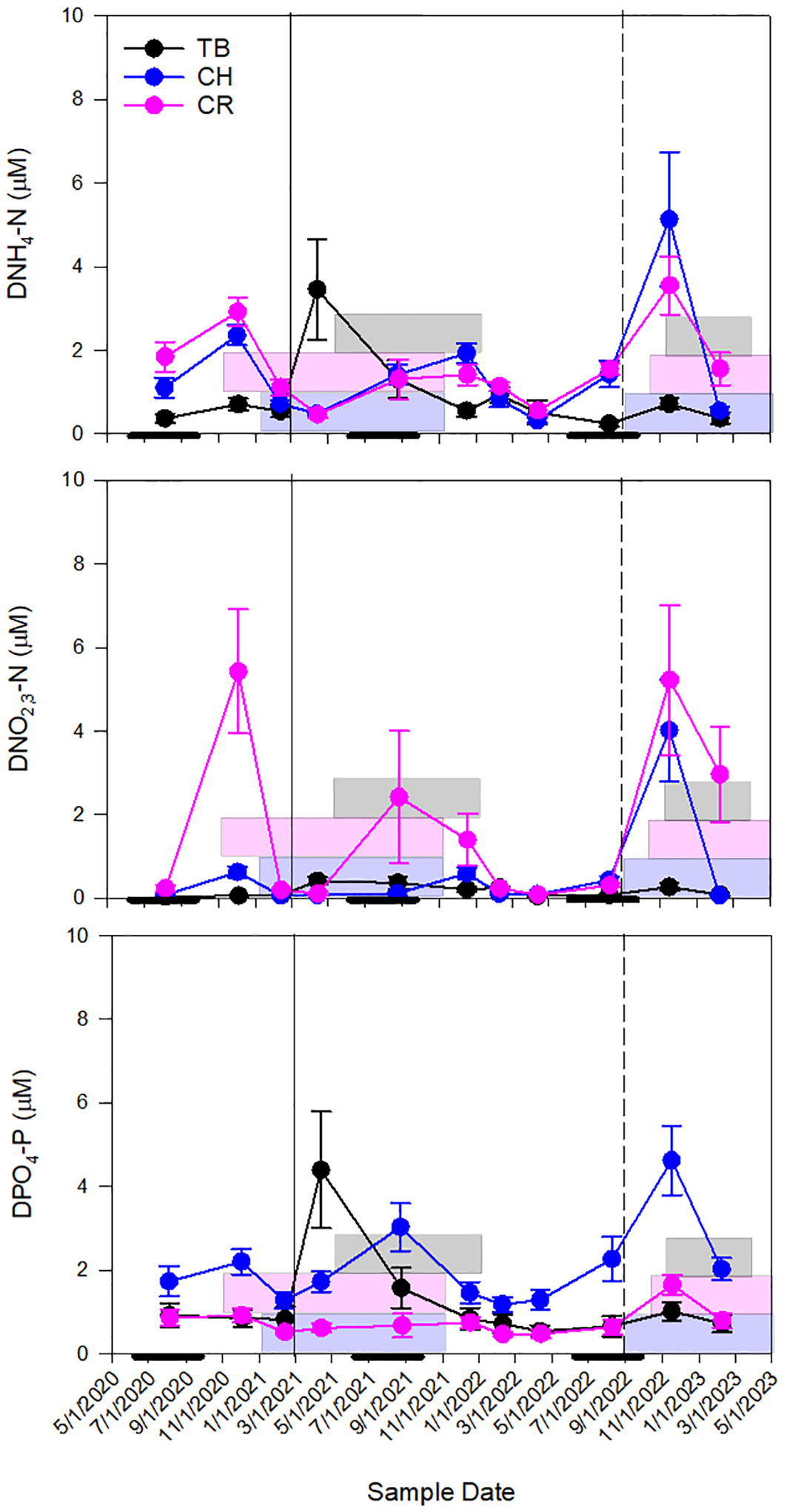 Seasonal patterns of mean dissolved ammonia (DNH4-N), nitrate-nitrite (DNO2,3-N), and phosphate, (DPO4-P) concentrations at all stations throughout the sampling period (TB – Tampa Bay, CH – Charlotte Harbor and CR – the Caloosahatchee River). Error bars are standard error. The solid line represents the mining release event (in Tampa Bay, September 2021) and the dashed line represents Hurricane Ian (September 2022). Gray boxes represent K. brevis bloom conditions in TB, pink boxes represent K. brevis bloom conditions in CH and blue boxes represent K. brevis bloom conditions in CR. Thick black lines along the x-axis represent the wet season in the west coast of Florida (June 1-October 31).
