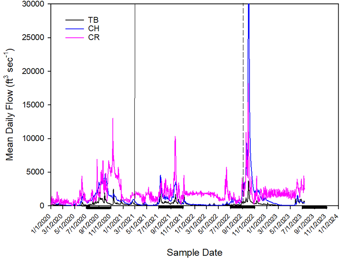 Ratios of DIN : DIP were consistently N-limited for all three estuaries with the exception of two TB stations in February 2022, one CH station in December 2021, and one CR station in April 2022. DIN : DIP ratios were highest in the Caloosahatchee River and were likely driven by the elevated NO2,3-N (p<0.001; Supplementary Figure 2; Supplementary Tables 3, 4).