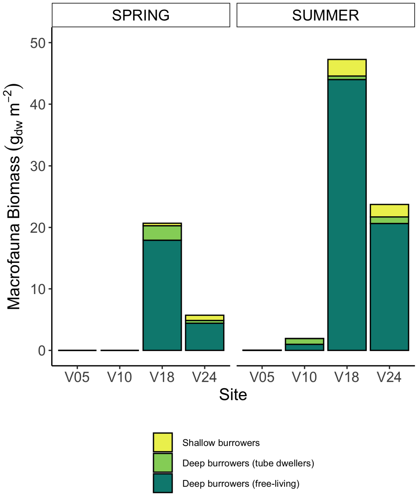 Average benthic fauna biomass retrieved at the four sites in the two seasons (gDW m-2) and grouped in three functional groups: shallow bioturbating organisms, deep burrowing taxa living in fixed tubes or dwellers, and deep burrowing taxa free-living.