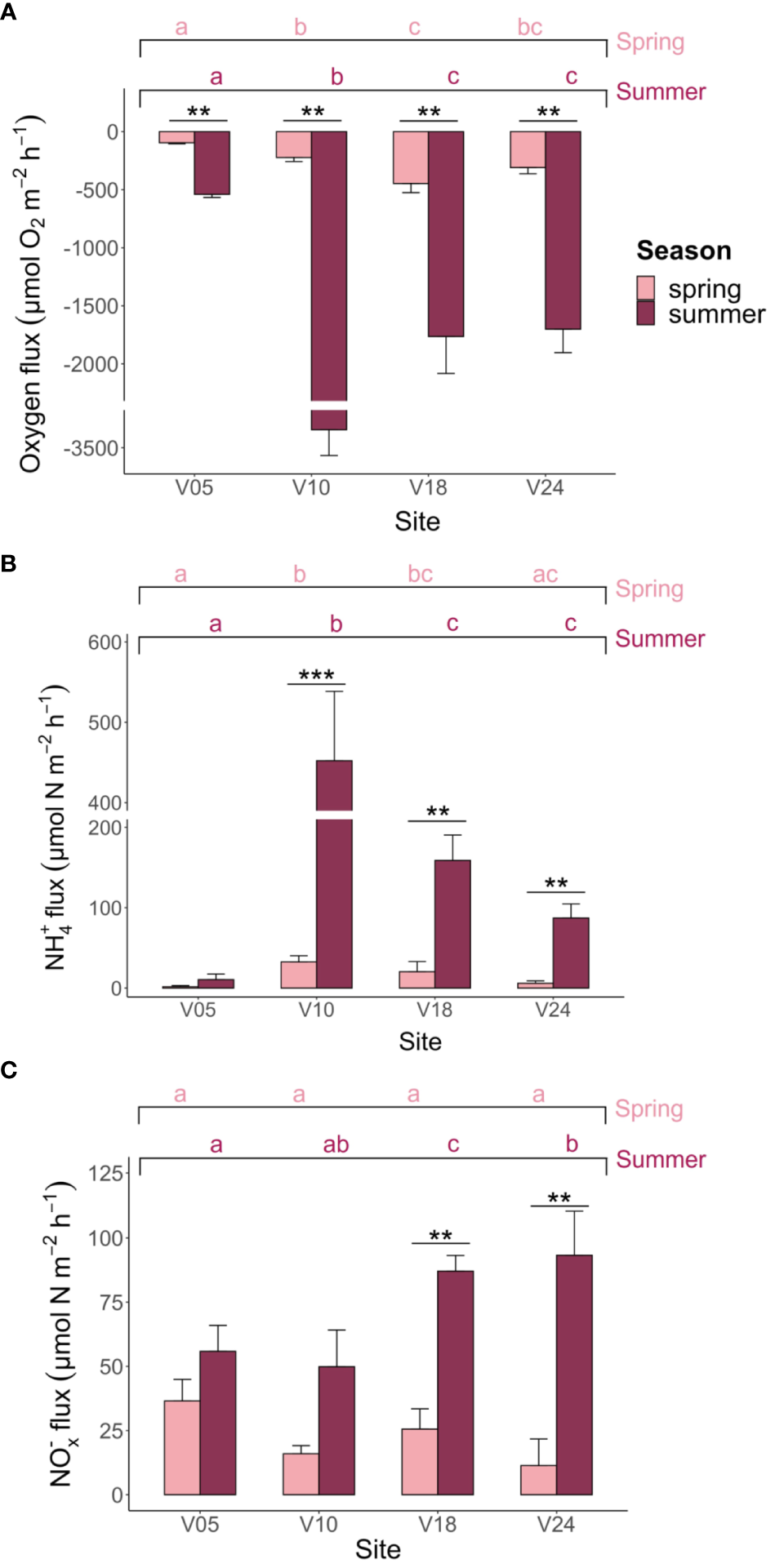 Net (A) O2, (B) NH4+ and (C) NOx- (NO3-+NO2-) fluxes measured at the four sites in spring and summer. Averages (n=6) ± standard errors are reported. The graphs present the outcomes of the pairwise comparison for the two-way PERMANOVA, focusing on the interaction between season and site where interaction effect was statistically significant (p< 0.05). Asterisks denote significant differences within each site, highlighting variations attributed to season. Meanwhile, letters denote significant differences within seasons, emphasizing site-related variations.