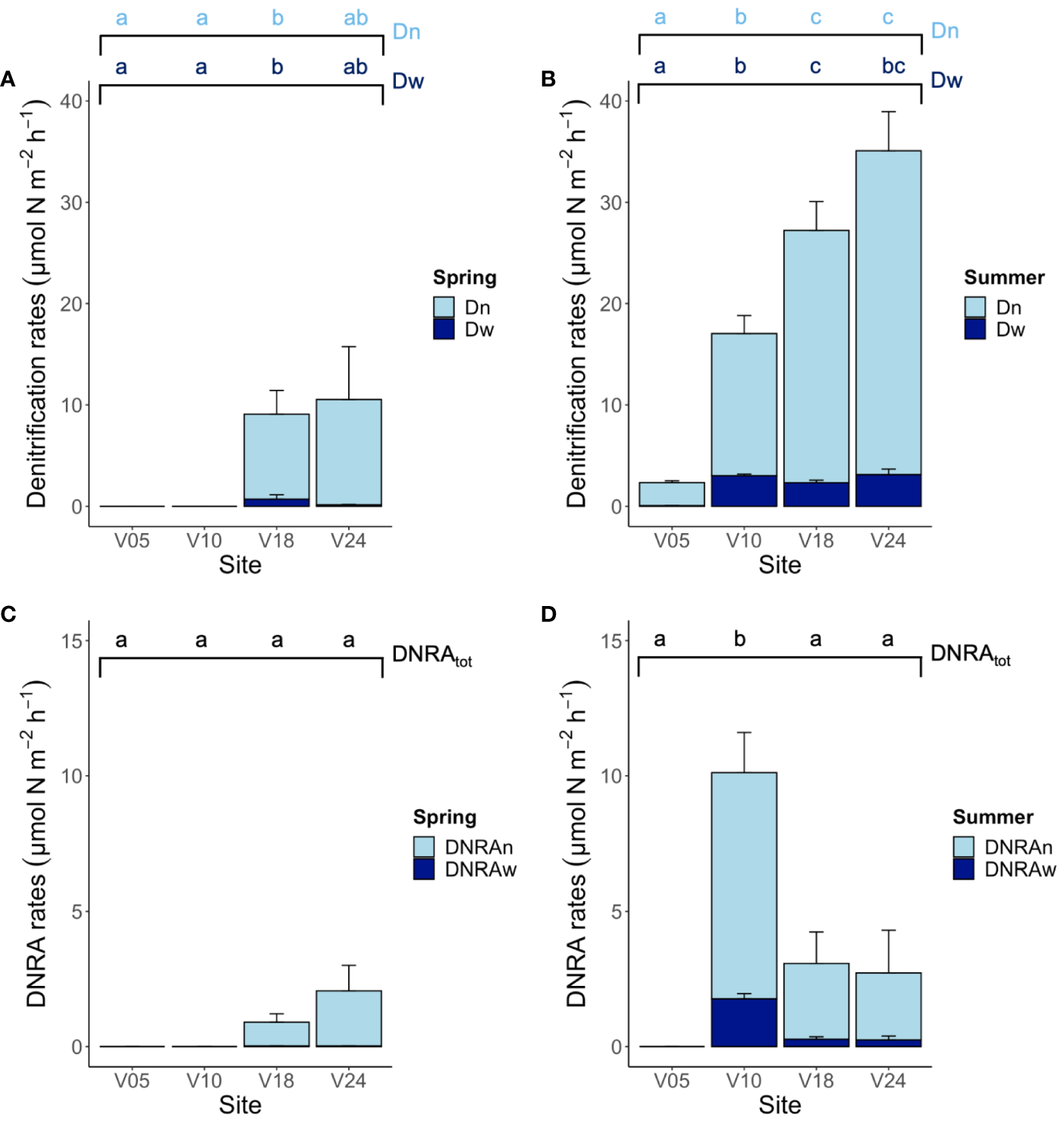 The staked bar chart in the upper panel depicts the rates of denitrification of nitrate produced via nitrification (Dn) and of nitrate diffusing into the sediment from the water column (Dw) measured at the four sites in (A) spring and (B) summer. The staked bar chart in the below panel depicts total DNRA rates divided into the DNRA coupled to nitrification (DNRAn) and DNRA of water column nitrate (DNRAw) measured at the four sites in (C) spring and (D) summer. Averages (n=6) ± standard errors are reported. Note the different scales on y-axis in the two panels. The graph presents the results of the pairwise comparison for the two-way PERMANOVA, investigating the interaction between season and site. Letters indicate statistically significant differences among sites within season (p< 0.05).