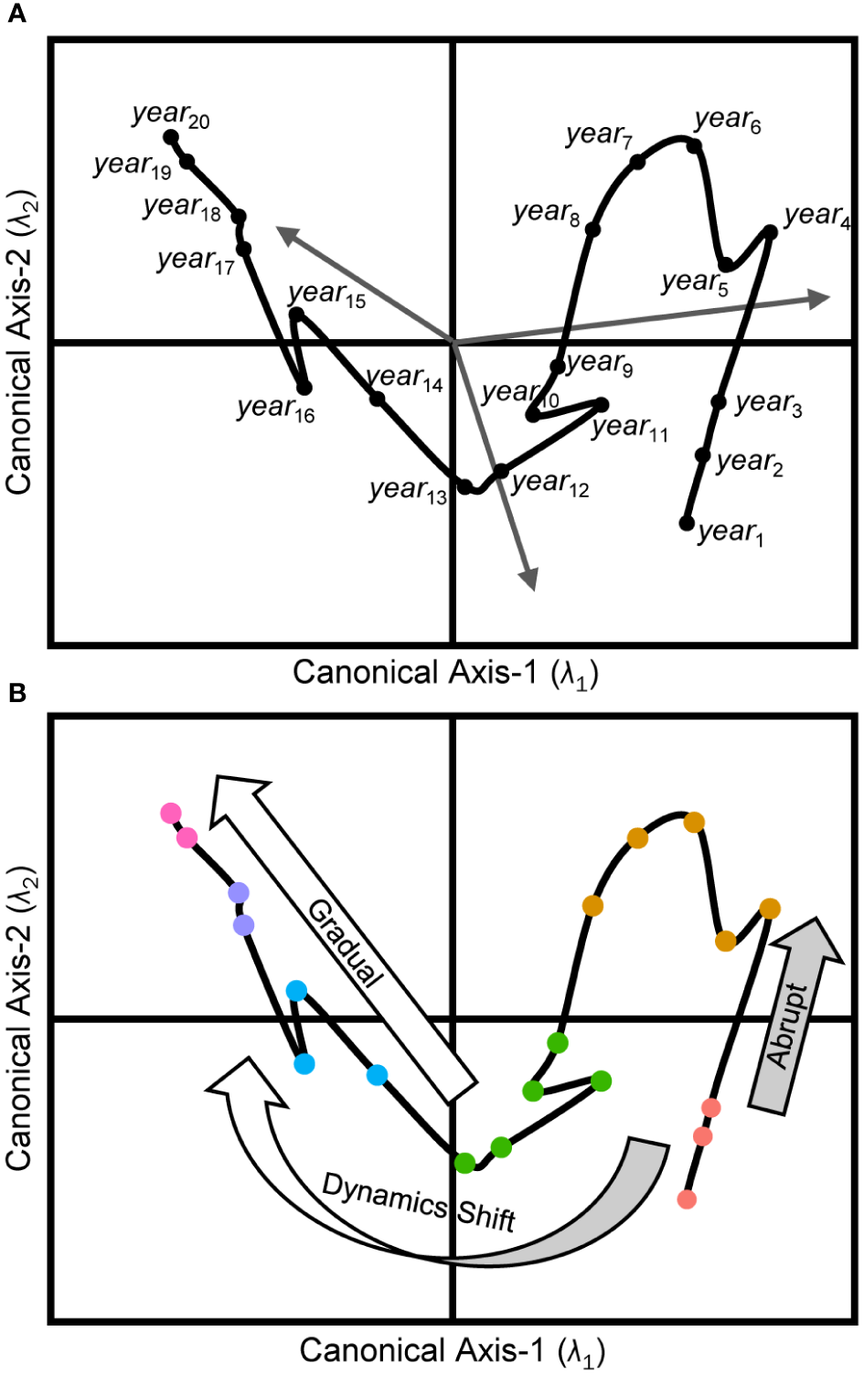 Conceptual model of ecosystem trajectories. Panel (A) illustrates an RDA ordination diagram projecting each object (yeari) from a multivariable response data set (Y) into canonical space defined by the model. Placement of objects (black dots) is related to the Euclidean dissimilarities derived from the same suite of response descriptors. Sites’ proximities are indicative of their resemblance, with sites closer together being more alike. Each orthogonal canonical axis (λi) accounts for an explained proportion (R2) of the total variability in Y, and the hierarchy of these axes is always such that R2λ1 > R2λ2. The terminating coordinates for response vectors (gray arrows) along each axis capture each indicator’s correlation with the model’s canonical axes’ scores. The ecosystem trajectory (black line) captures the chronological changes to the configuration of the underlying responses defining the system. Panel (B) depicts the classification of regime states (colored circles) for the same objects along the ecosystem trajectory. Large arrows align with abrupt (light gray arrow) and gradual (white arrow) transitions of the ecosystem trajectory as it evolves over short and long timescales, respectively. The curved bicolor arrow illustrates an example of a paradigm shift in the controlling organizational dynamics, ultimately resulting in the system trajectory trending in a completely new direction than previously observed.