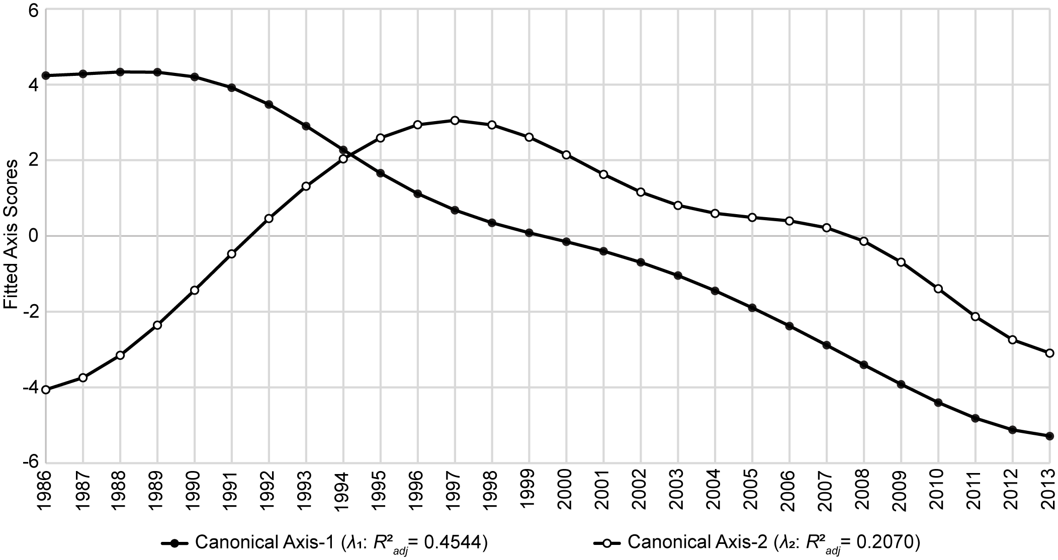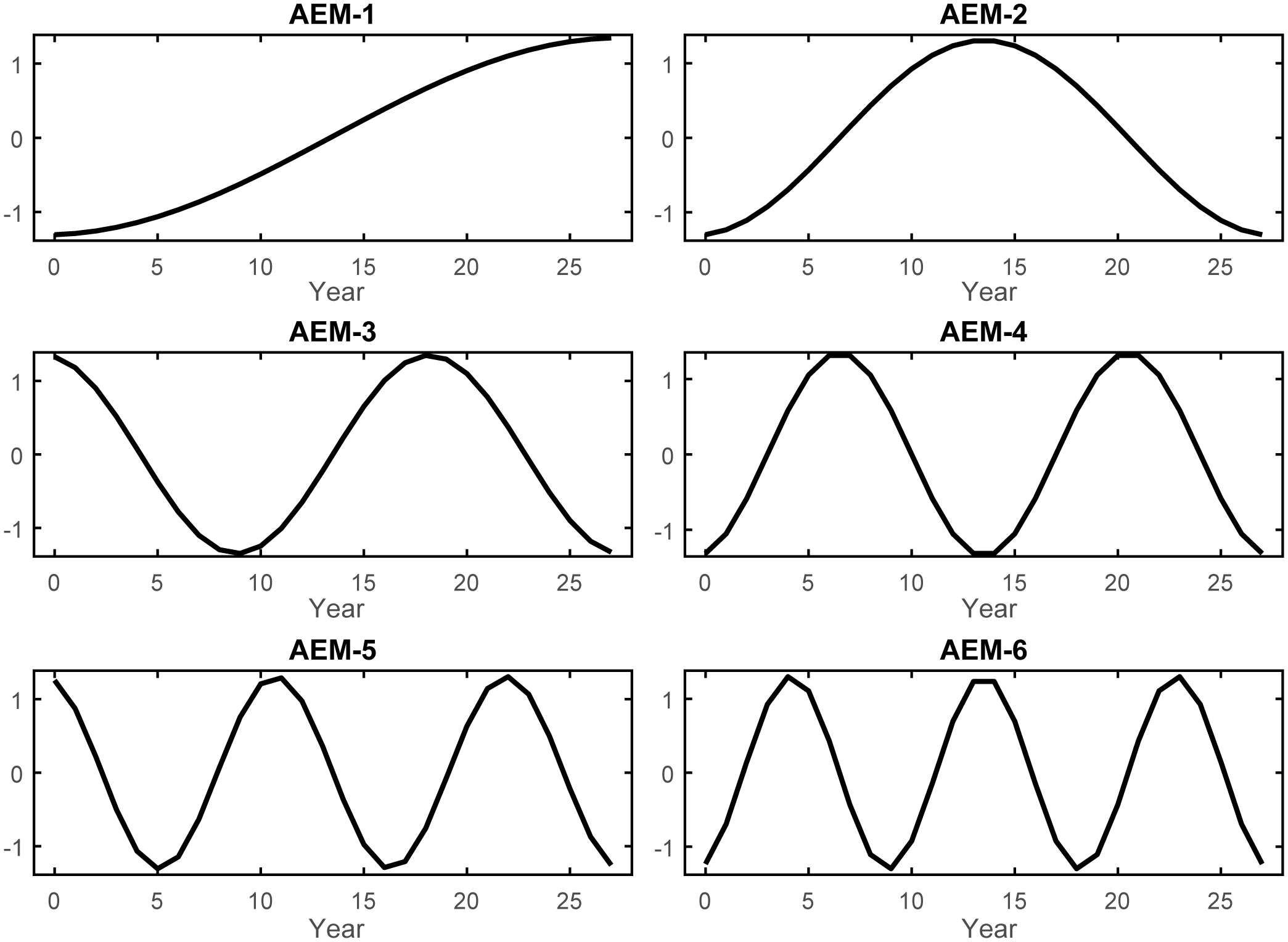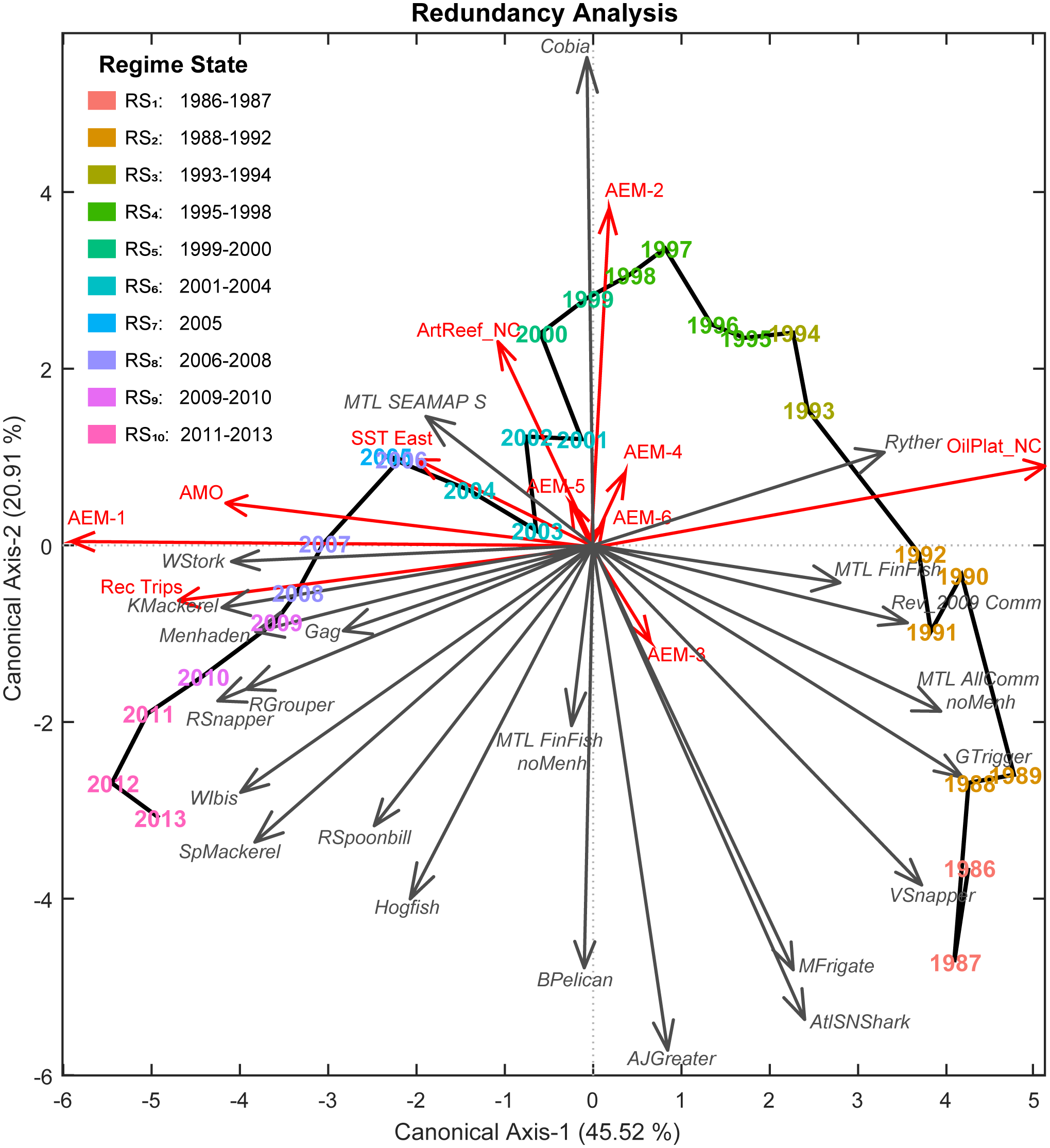 Lastly, to explicitly account for temporal variability in the organization of resources and the trajectory of the GoM fishery ecosystem, a series of synthetic predictors (T) were generated using asymmetric eigenvector mapping (AEM) (Blanchet et al., 2008b, 2011). Via this method, the regular, annual-interval time-series spanning 1986–2013 was decomposed into a set of periodic eigenfunctions encompassing all temporal correlation scales and frequencies within the 28-year period (Supplementary Figure S3). These predictors were then employed in subsequent variable selection routines and canonical analyses to gain insights into the temporal determinants of the fishery ecosystem’s trajectory, stable states, and shifts. Thus, this approach helps enable the identification of future tipping points and shifts by modeling historical patterns in resources’ responses as they relate to the explicit scales of variability represented by the selected AEMs (Angeler et al., 2013; Legendre and Gauthier, 2014; Baho et al., 2015).