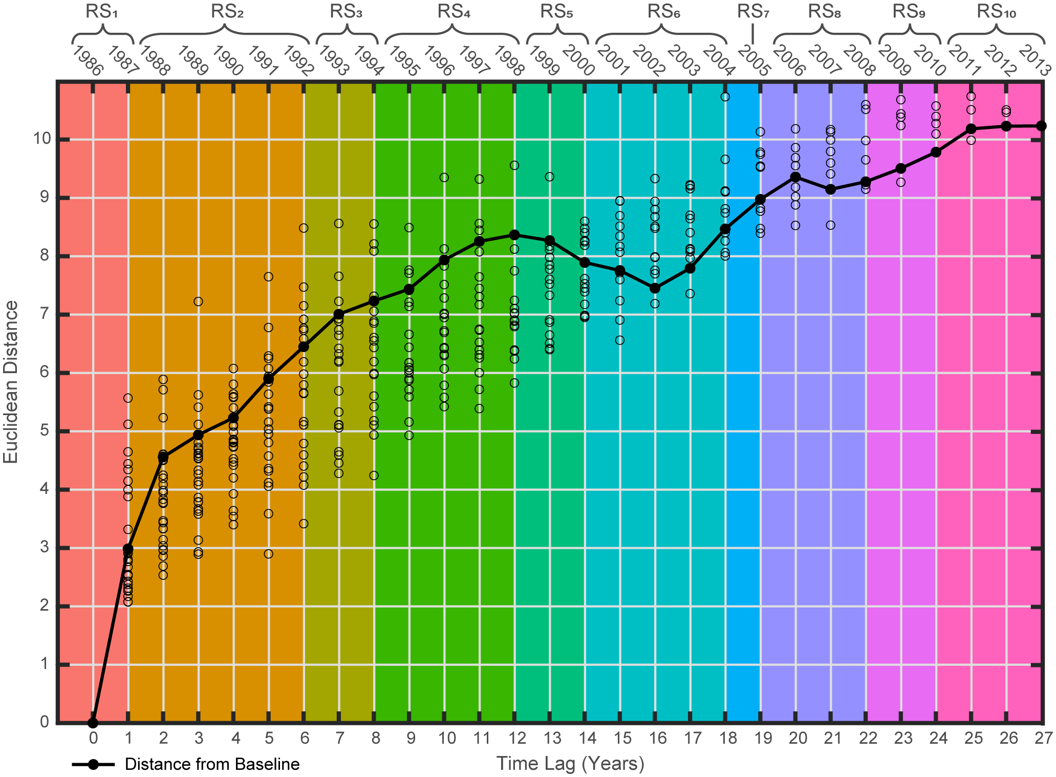 Multivariate ordination and dimension-reduction methods are often used to describe complex ecological systems. Techniques such as principal components analysis (PCA), principal coordinates analysis (PCoA) (Gotelli and Ellison, 2004), and non-metric multidimensional scaling (nMDS) (Legendre and Legendre, 2012) are commonly used to visualize these intricate systems. Analogous constrained methods, such as classical redundancy analysis (RDA) (Rao, 1964; Legendre and Legendre, 2012) and its distance-based equivalent (dbRDA) (Legendre and Anderson, 1999), or canonical analysis of principal coordinates (CAP) (Anderson and Willis, 2003), are often employed to test specific hypotheses within these systems. These multivariate statistical methods effectively quantify changes in the organization of the selected indicators used to describe the focal ecosystem, and they often rely on appropriate resemblance measures (Faith et al., 1987; Clarke et al., 2006) to relate multivariable observations, reflecting the correspondence between objects. In cases where dissimilarity metrics are used for visualizations, the spatial separation between two observations in an ordination space signifies their resemblance such that closer placement indicates greater likeness in the underlying descriptors’ observations. Chronologically observing the shifting positions of objects in these spaces may reveal unique interrelationships and temporal organizations among the focal system’s characteristics, and thus define its state trajectory (Link et al., 2002; Mollmann and Diekmann, 2012) through time (Figure 1).
