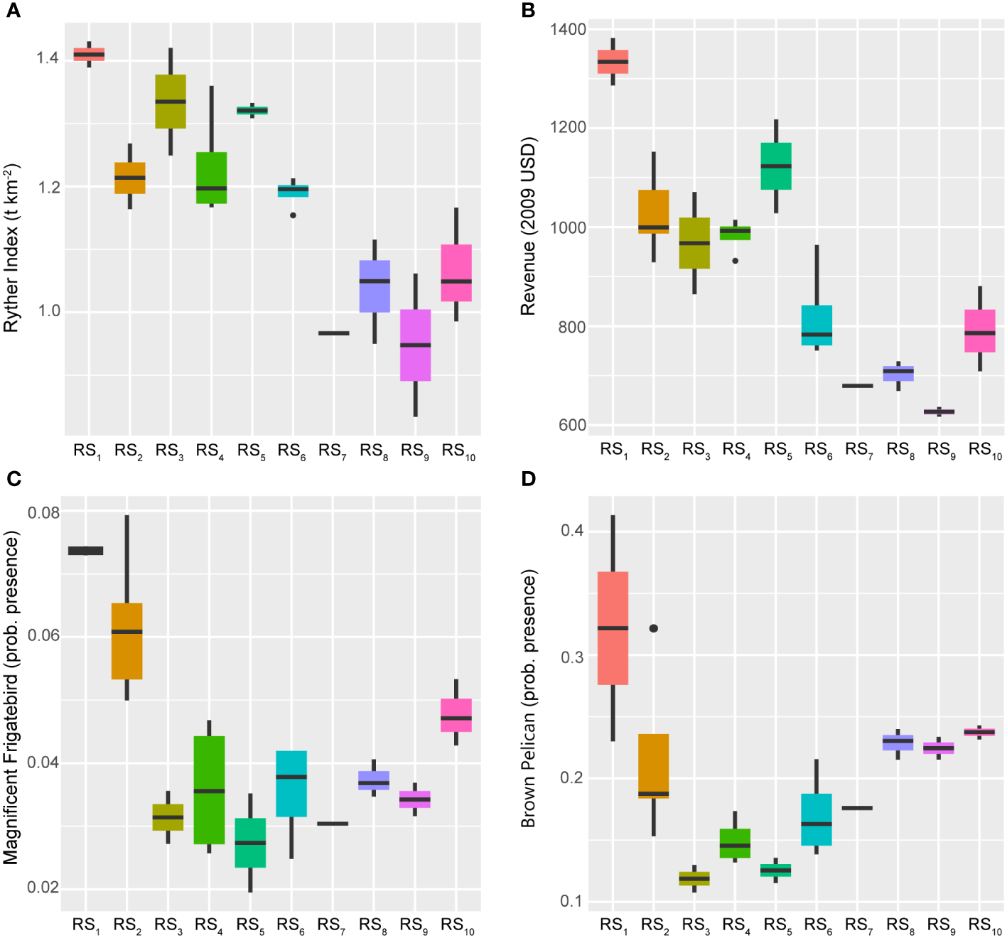 The final two response indicators included in this fishery ecosystem analysis were related to socio-economic aspects of the GoM LME. Firstly, to gauge the overall economic impact of large-scale commercial fisheries, the total U.S. GoM commercial fisheries revenues adjusted to 2009 U.S. dollars (Karnauskas et al., 2017a) were retained. Secondly, the Ryther index, a standardized metric of total annual fisheries removals distributed across space (t km-2 yr-1), was included as a means to monitor ecosystem overfishing (Link and Watson, 2019). It is worth noting that the Ryther index is the only indicator not sourced from the 2017 GoM ESR.