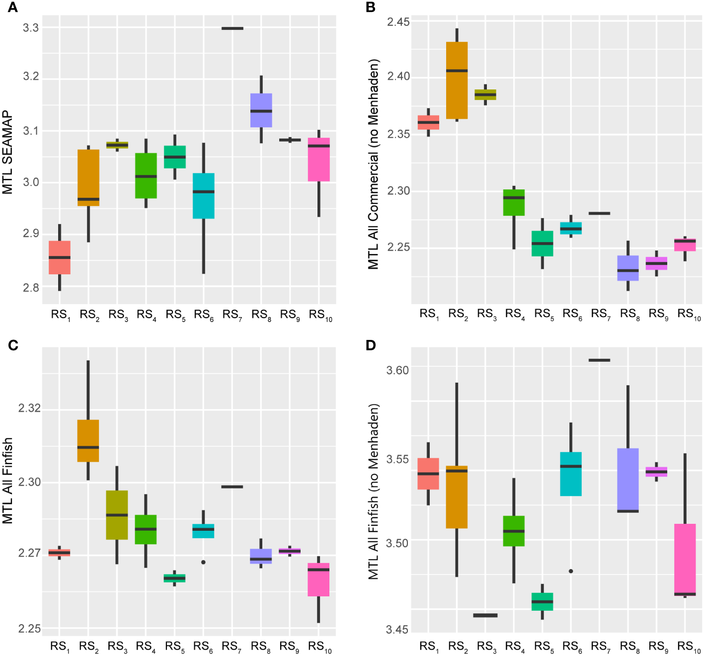 | MTL FinFish noMenh | MTL of all commercial finfish catches excluding Menhaden [Trophic units] | – | Multispecies stock structure - FDM | – |