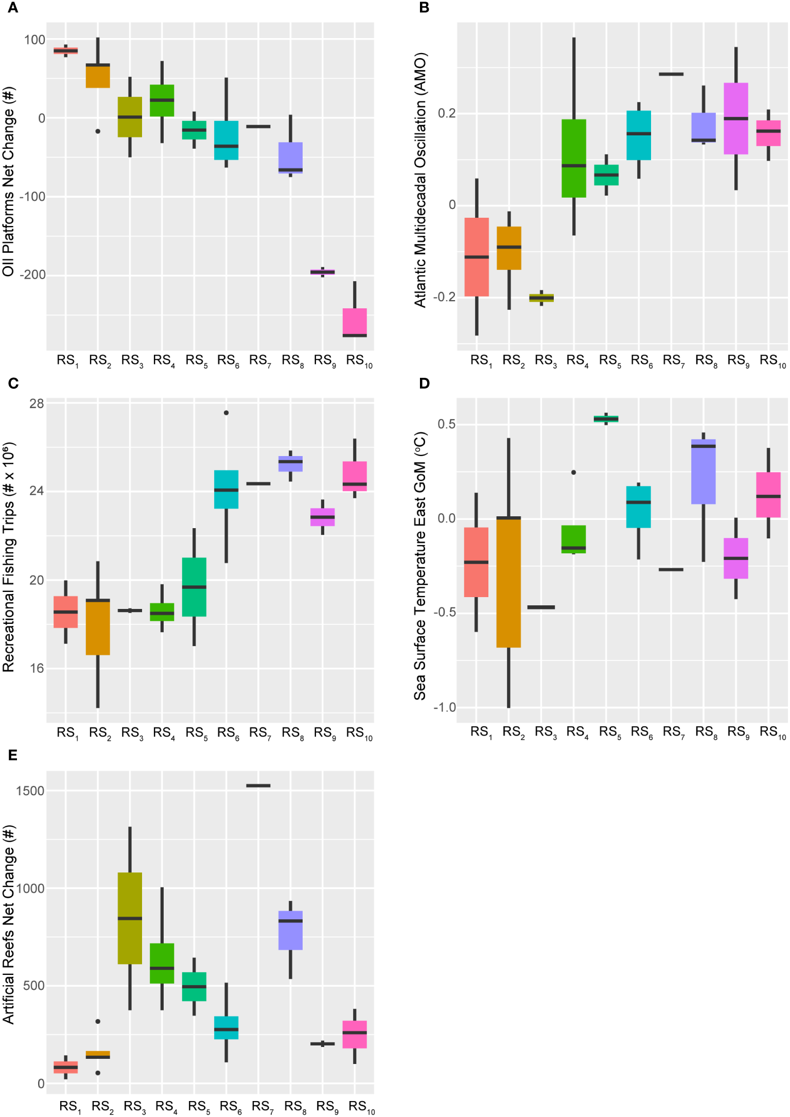 This study incorporated four large-scale indicators of sea surface temperature (SST) related to global climate trends. Specifically, three descriptors directly accounted for mean annual SST anomalies across three distinct sub-regions within the GoM LME – the western, central, and eastern regions – while the fourth served as a proxy for temperature changes in the northern Atlantic basin, the Atlantic Multidecadal Oscillation (AMO) (Schlesinger and Ramankutty, 1994).