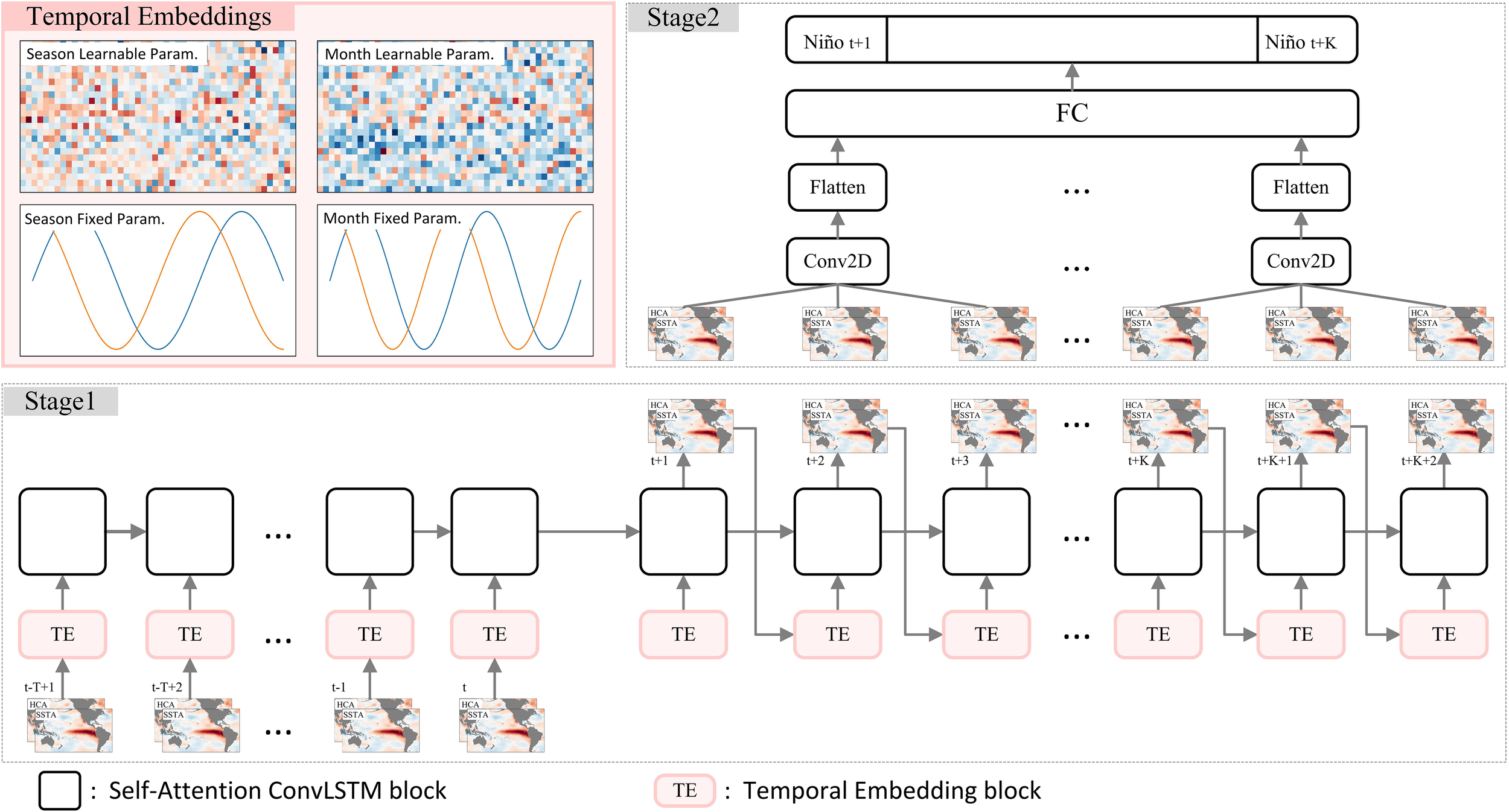 Architecture of the Two-Stage SpatioTemporal (TSST) prediction model for ENSO forecasting. Stage 1 (beneath the figure) illustrates the unfolded architecture of the autoregressive model based on the self-attention ConvLSTM network. The input comprises historical data of SSTA and HCA for T steps, while the output includes predicted SSTA and HCA for the future K+2 steps. At each step, the input undergoes a time encoding block that integrates the current meteorological feature with corresponding seasonal and monthly encoding features (details in the top-left corner of the figure). Stage 2 (depicted in the top-right corner) showcases the structure of the mapping model, where the predicted SSTA and HCA for the future K+2 steps from Stage 1 are grouped in sets of three consecutive steps and fed into the Stage 2 model. This data then undergoes convolution, pooling, flattening, fully connected layers, and is mapped to the corresponding Niño 3.4 value for that specific time step. In this study, T is set to 12, and K is set to 24. .
